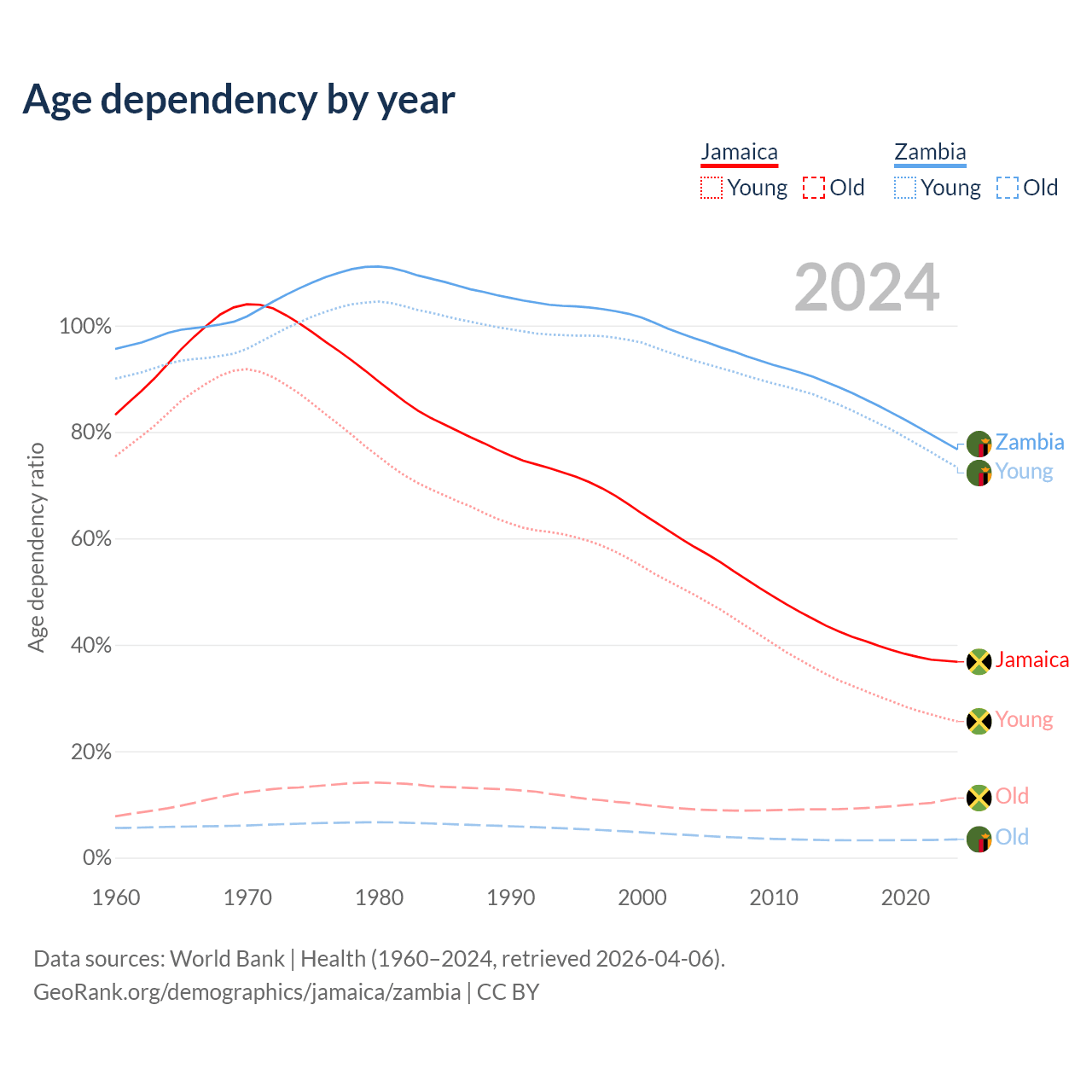 - Jamaica is ranked 87/196 by median age (oldest to youngest) vs 182/196 for Zambia.