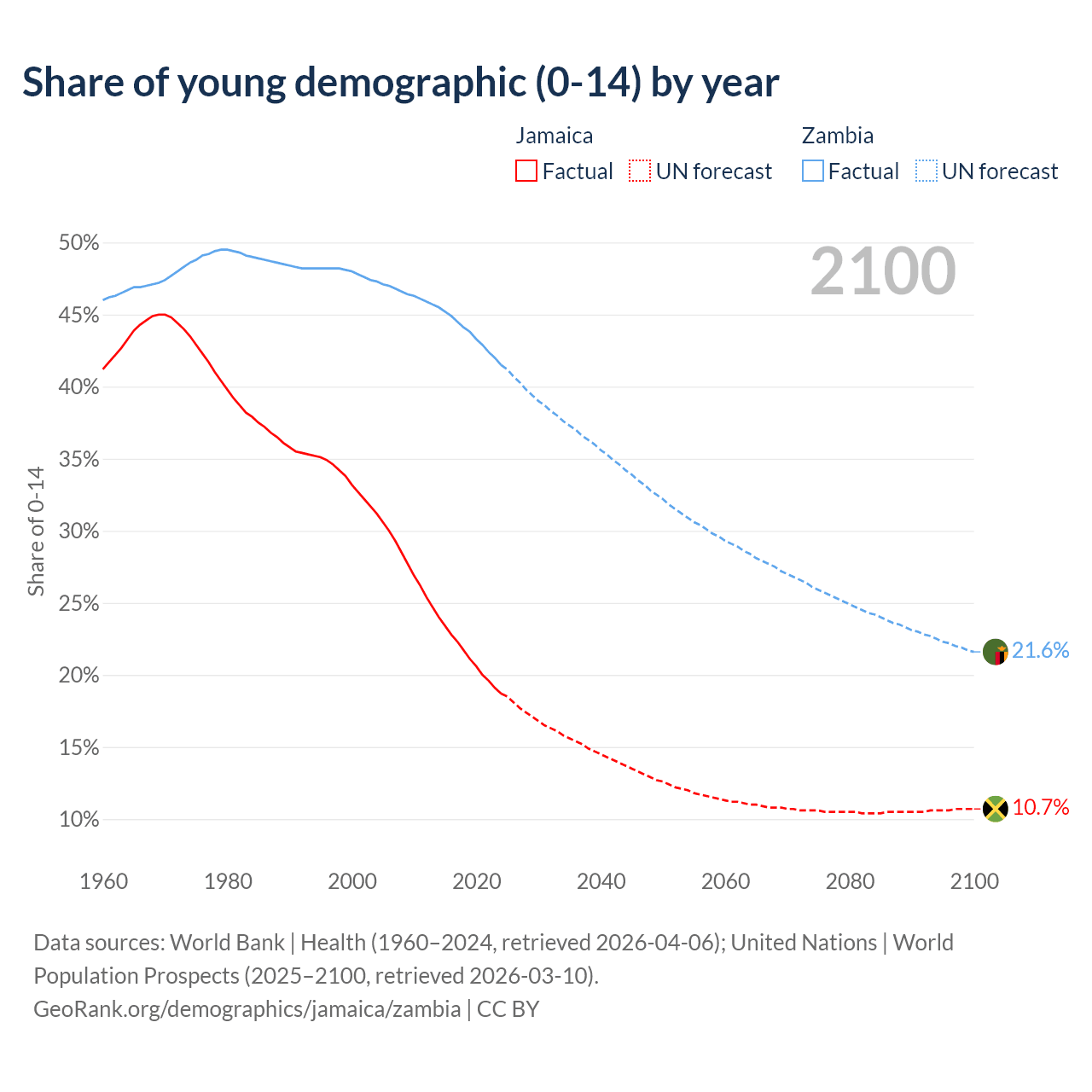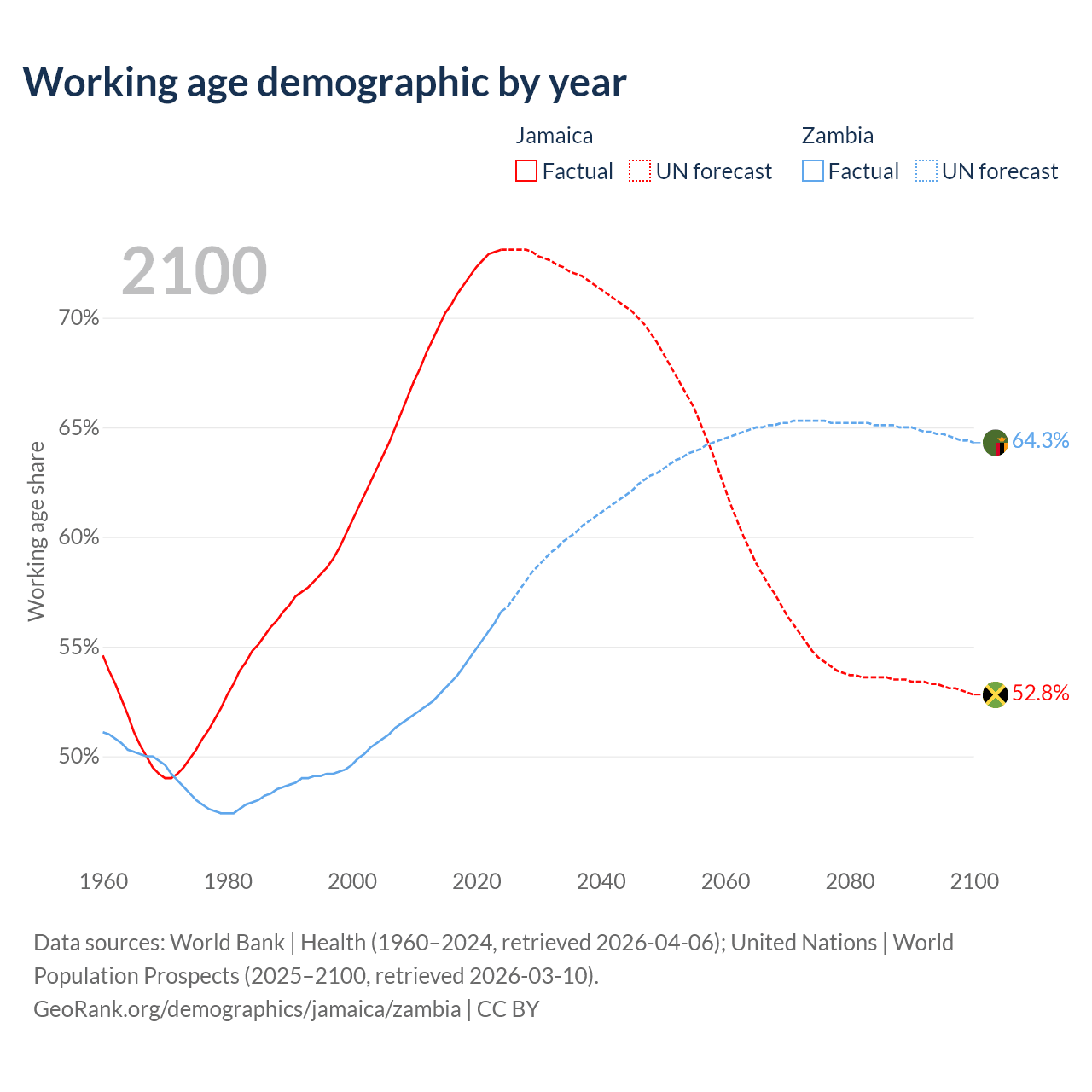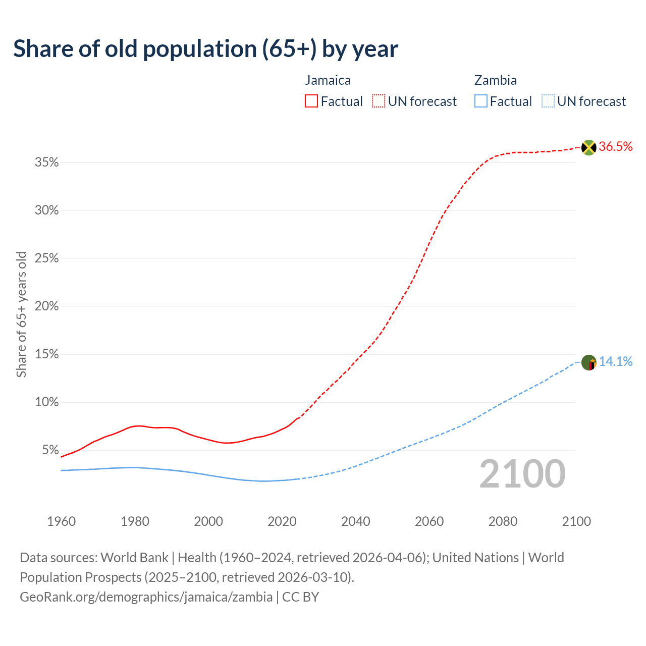 The share of older people aged 65 and over is 8.21% in Jamaica and 1.95% in Zambia. Life expectancy in Jamaica compared to Zambia .