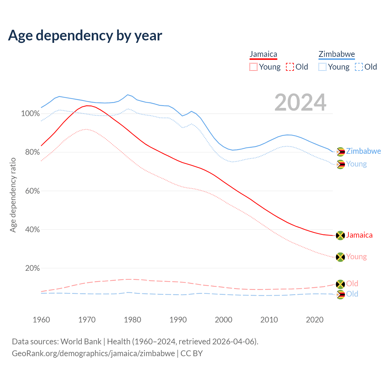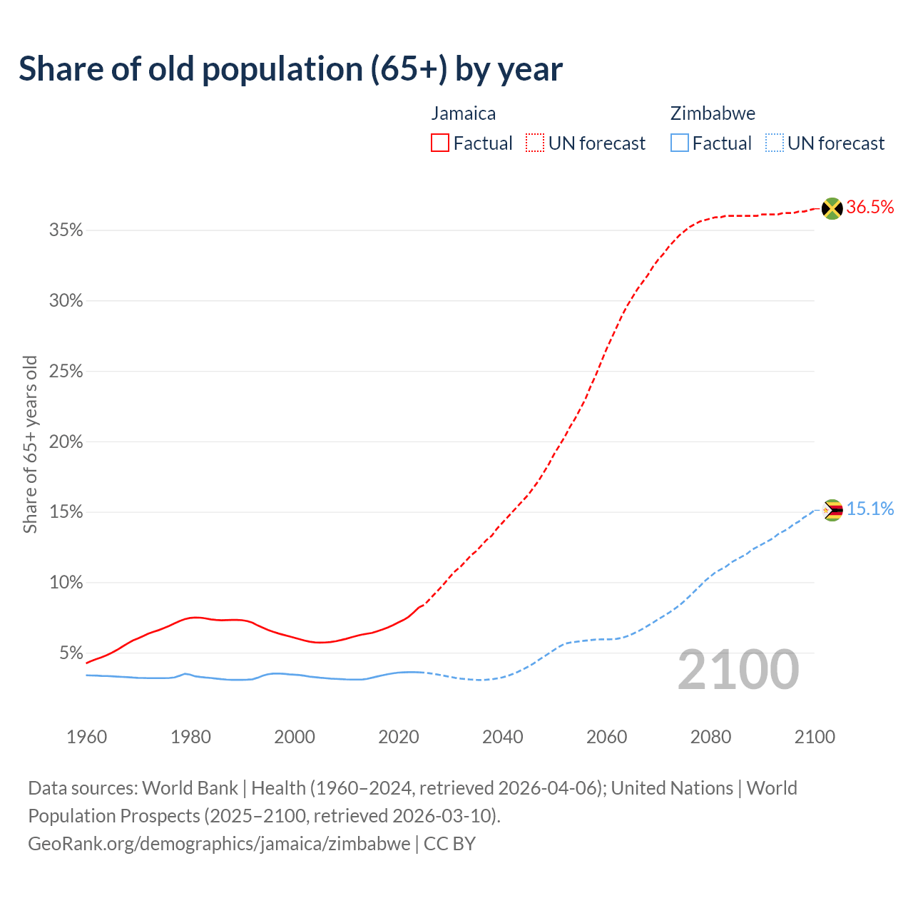 The share of older people aged 65 and over is 8.21% in Jamaica and 3.6% in Zimbabwe. Life expectancy in Jamaica compared to Zimbabwe .