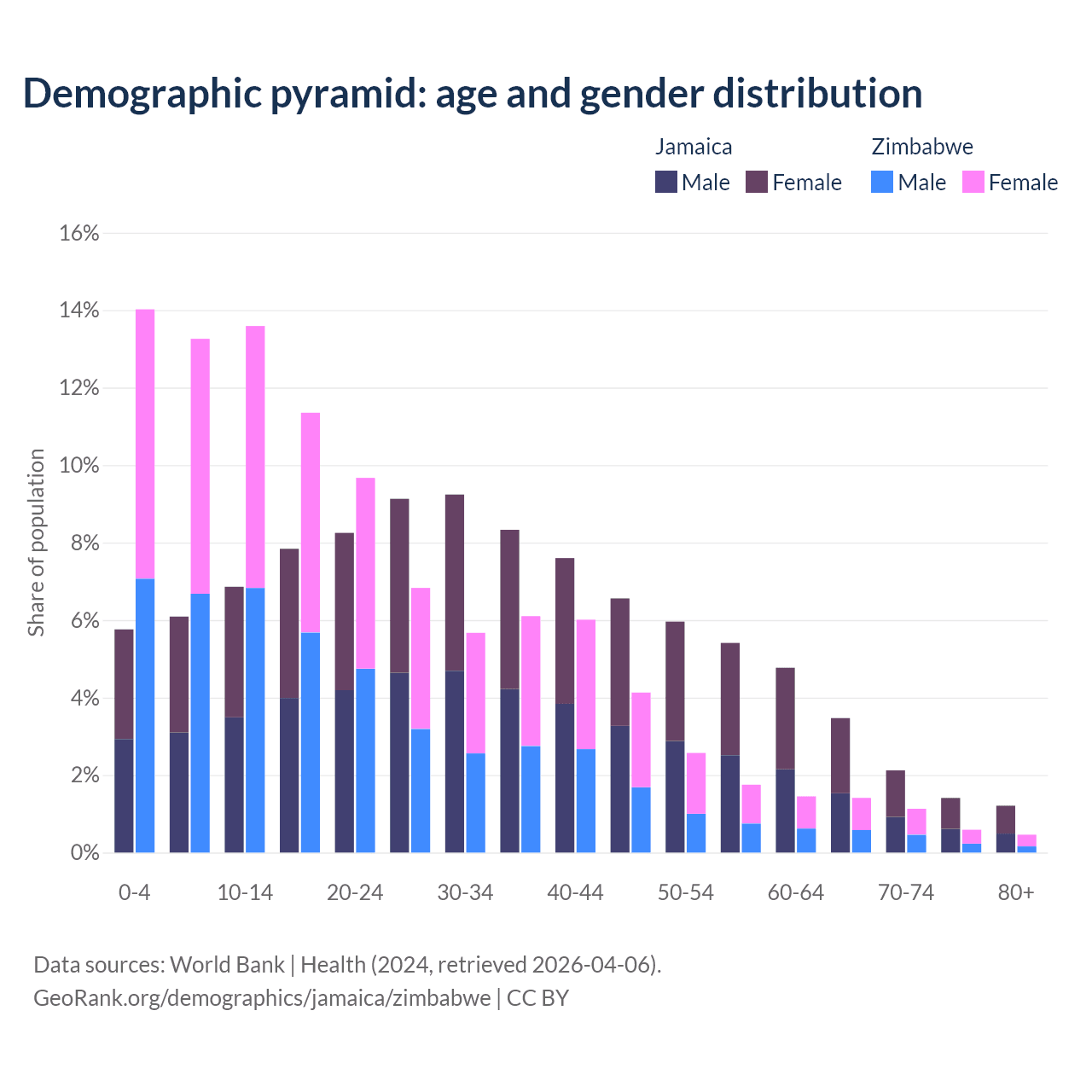- Jamaica is ranked 87/196 by median age (oldest to youngest) vs 177/196 for Zimbabwe.
