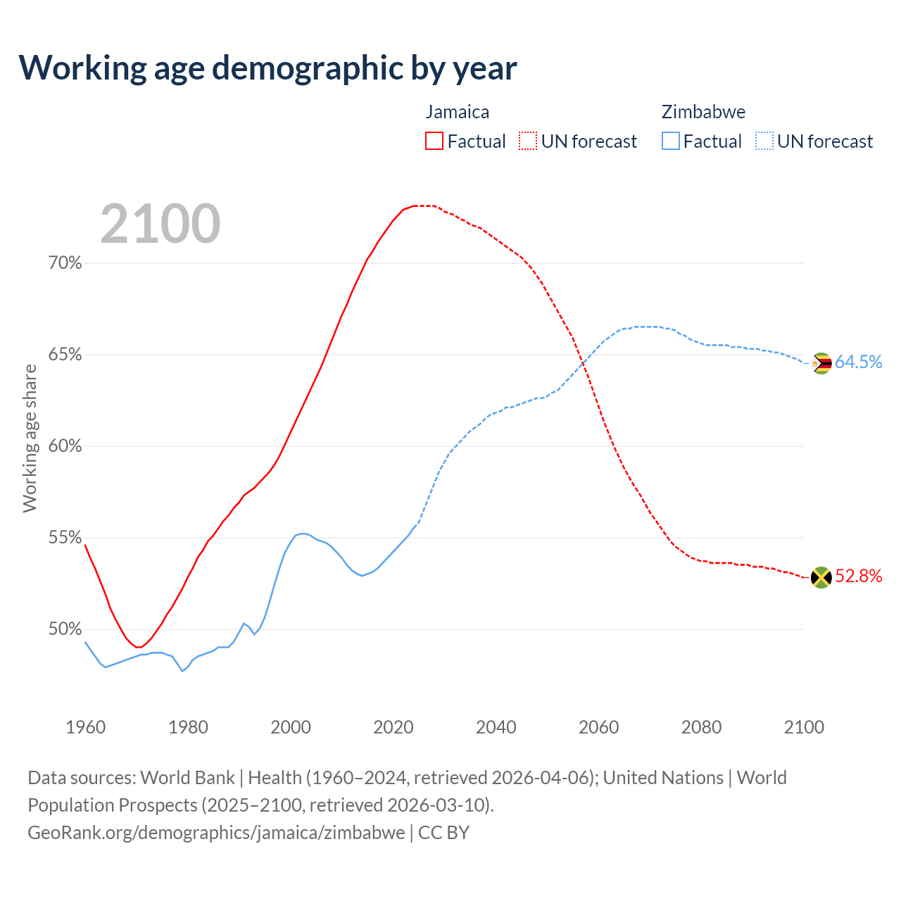 - Jamaica has 2.07M working age adults (aged 15-64) vs 9.64M in Zimbabwe.