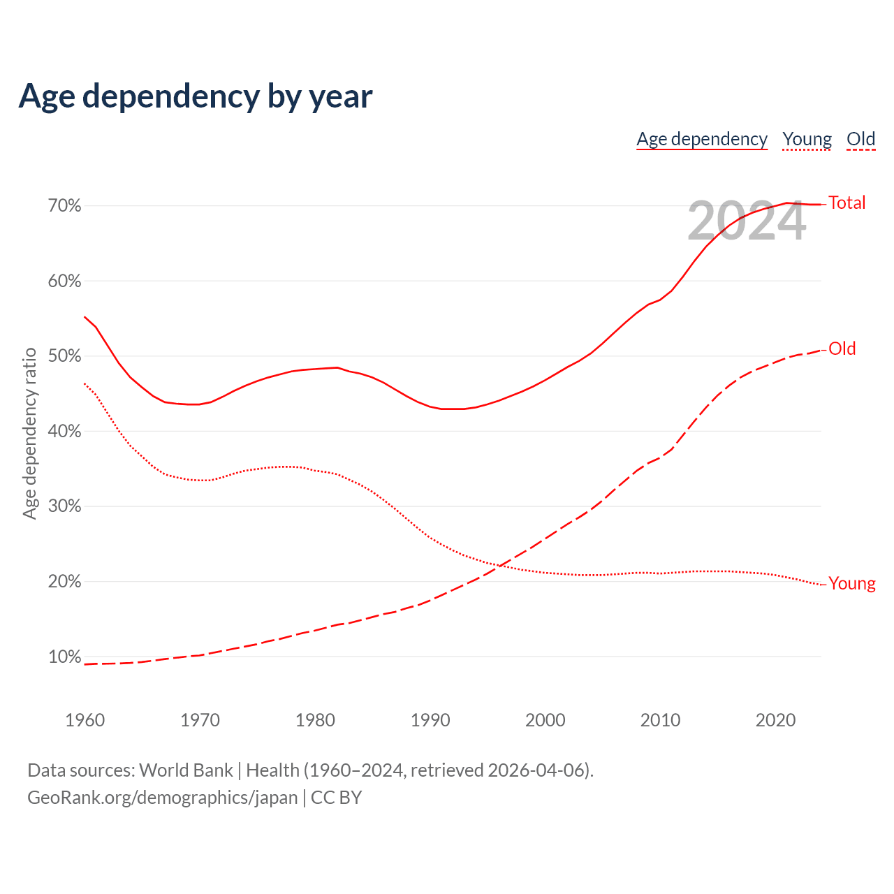 Data sources: World Bank | Health (1960–2024, retrieved 2026-04-06); U.S. Census Bureau (1960–2024, retrieved 2026-02-08).