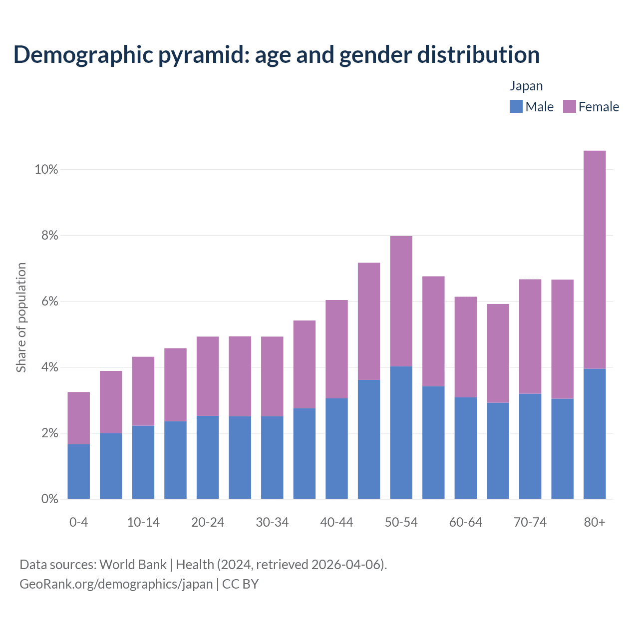 With a population of 124M people, Japan has a median age of 50.4 years which makes it the 2/196 oldest country. 11.4% of the demographic are children 0-14 years old, 58.8% are working-age people aged 15-64, and 29.8% are older population aged 65+ years.