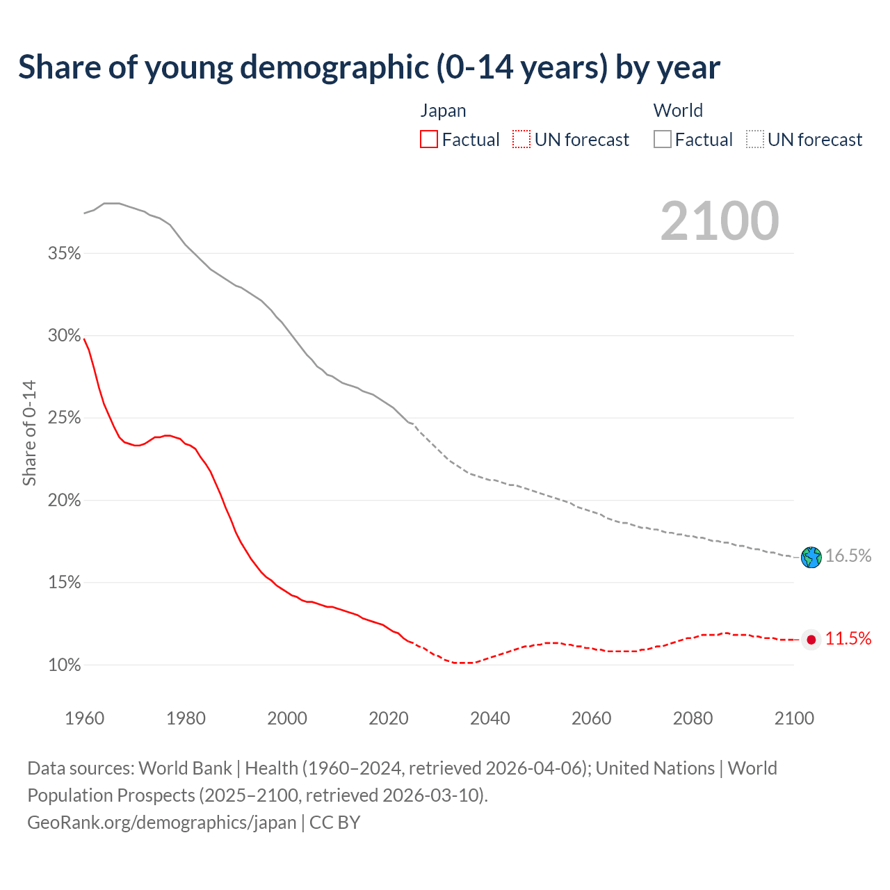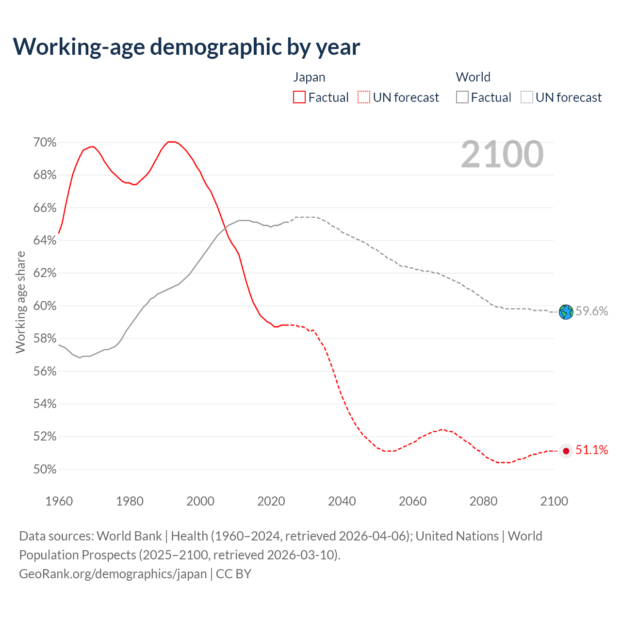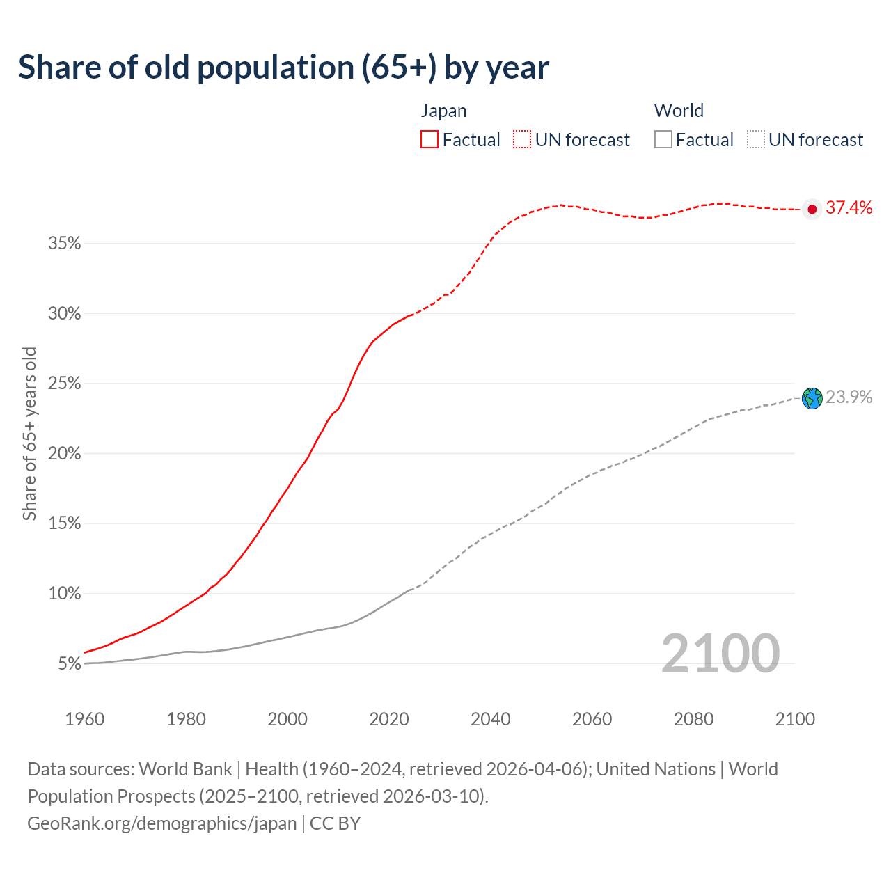 Median age in Japan, 1960–2100