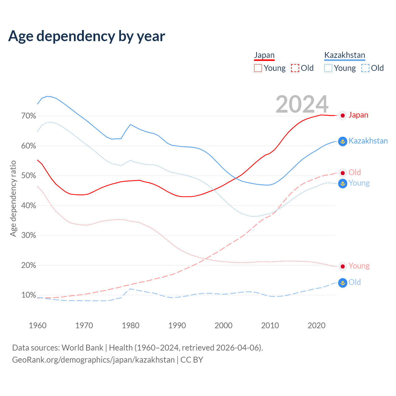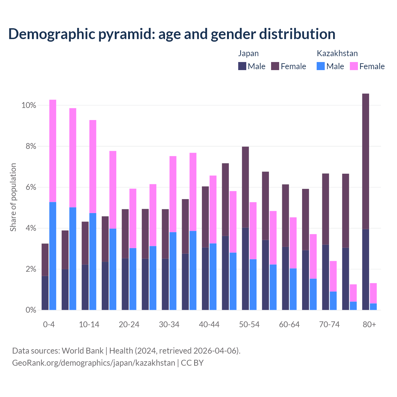 - Japan is ranked 2/196 by median age (oldest to youngest) vs 99/196 for Kazakhstan.
