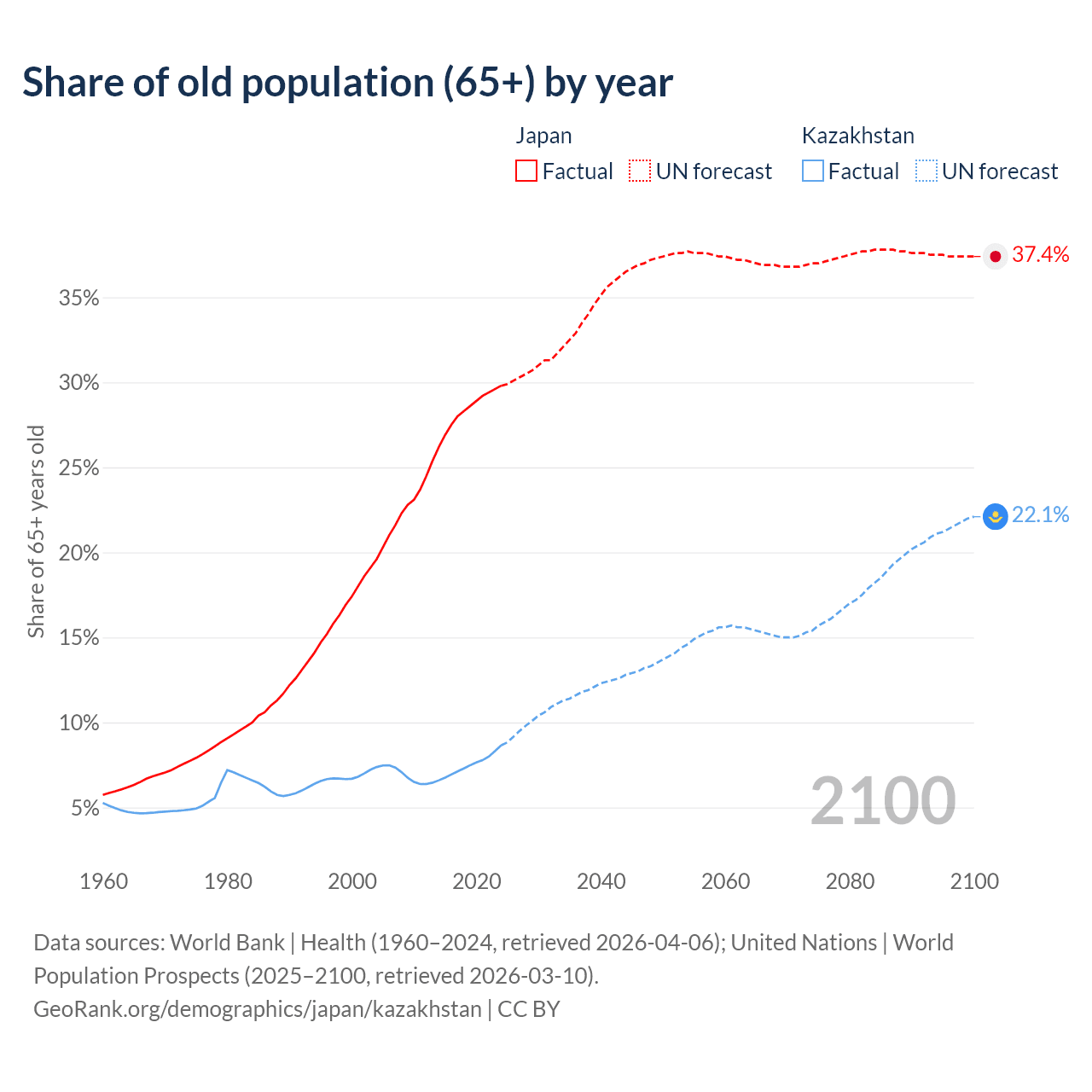 The share of older people aged 65 and over is 29.8% in Japan and 8.65% in Kazakhstan. Life expectancy in Japan compared to Kazakhstan .