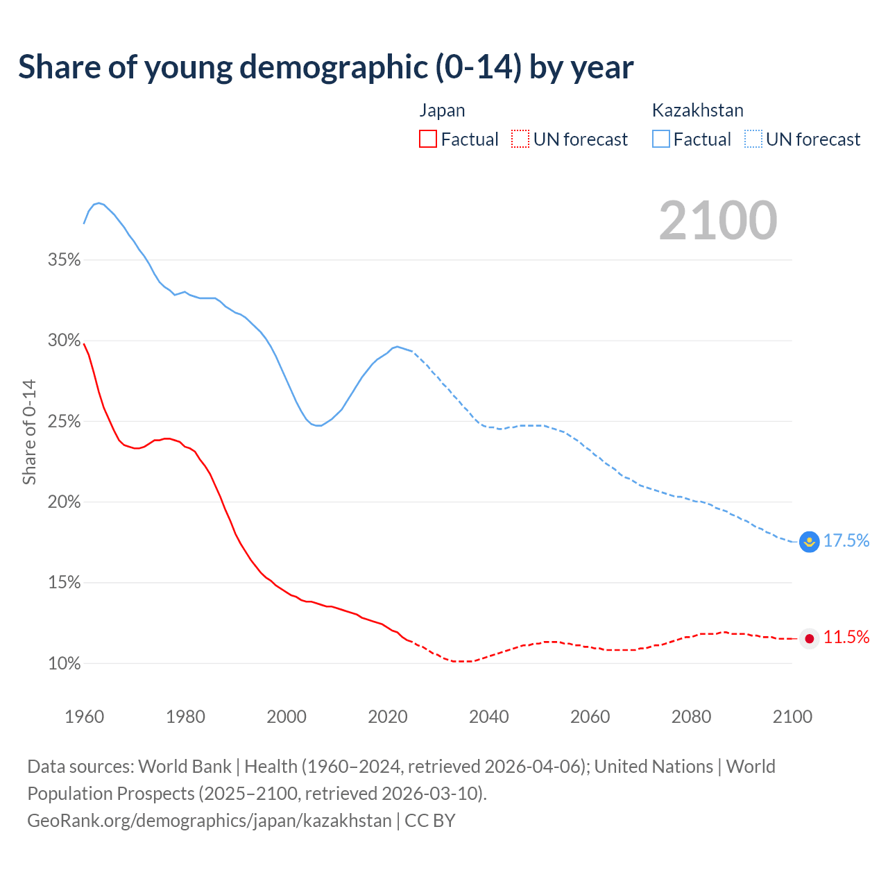 - The share of young demographic (0-15 years old) in Japan is 11.4% vs 29.4% in Kazakhstan.