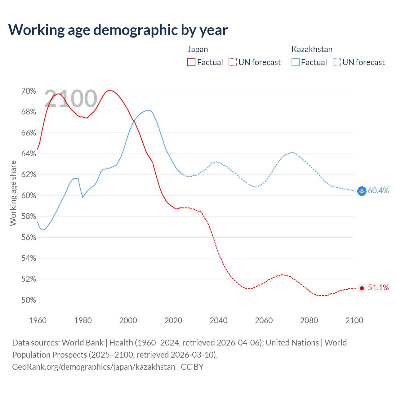 - Japan has 72.1M working age adults (aged 15-64) vs 13.1M in Kazakhstan.