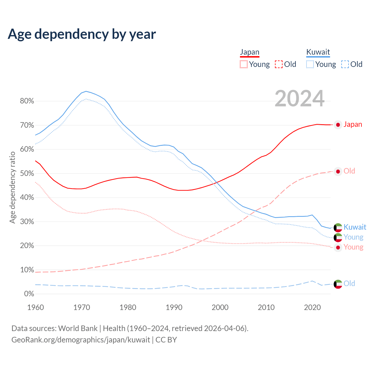- Japan is ranked 2/196 by median age (oldest to youngest) vs 71/196 for Kuwait.