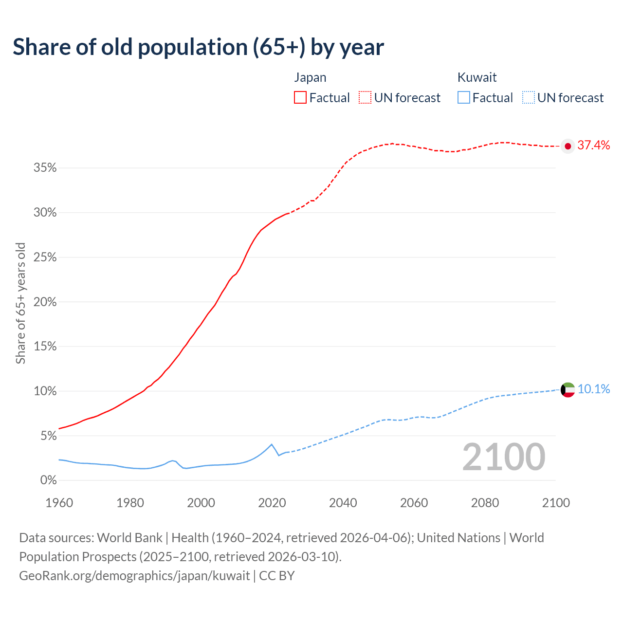 The share of older people aged 65 and over is 29.8% in Japan and 3.1% in Kuwait. Life expectancy in Japan compared to Kuwait .
