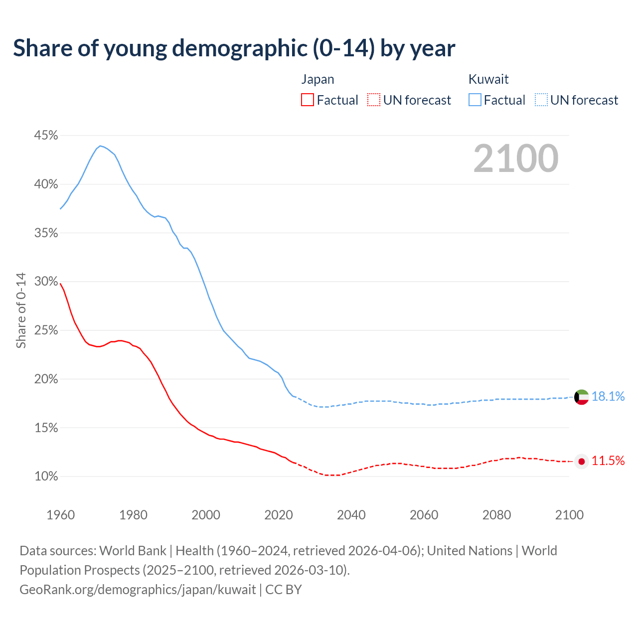 - The share of young demographic (0-15 years old) in Japan is 11.4% vs 18.2% in Kuwait.