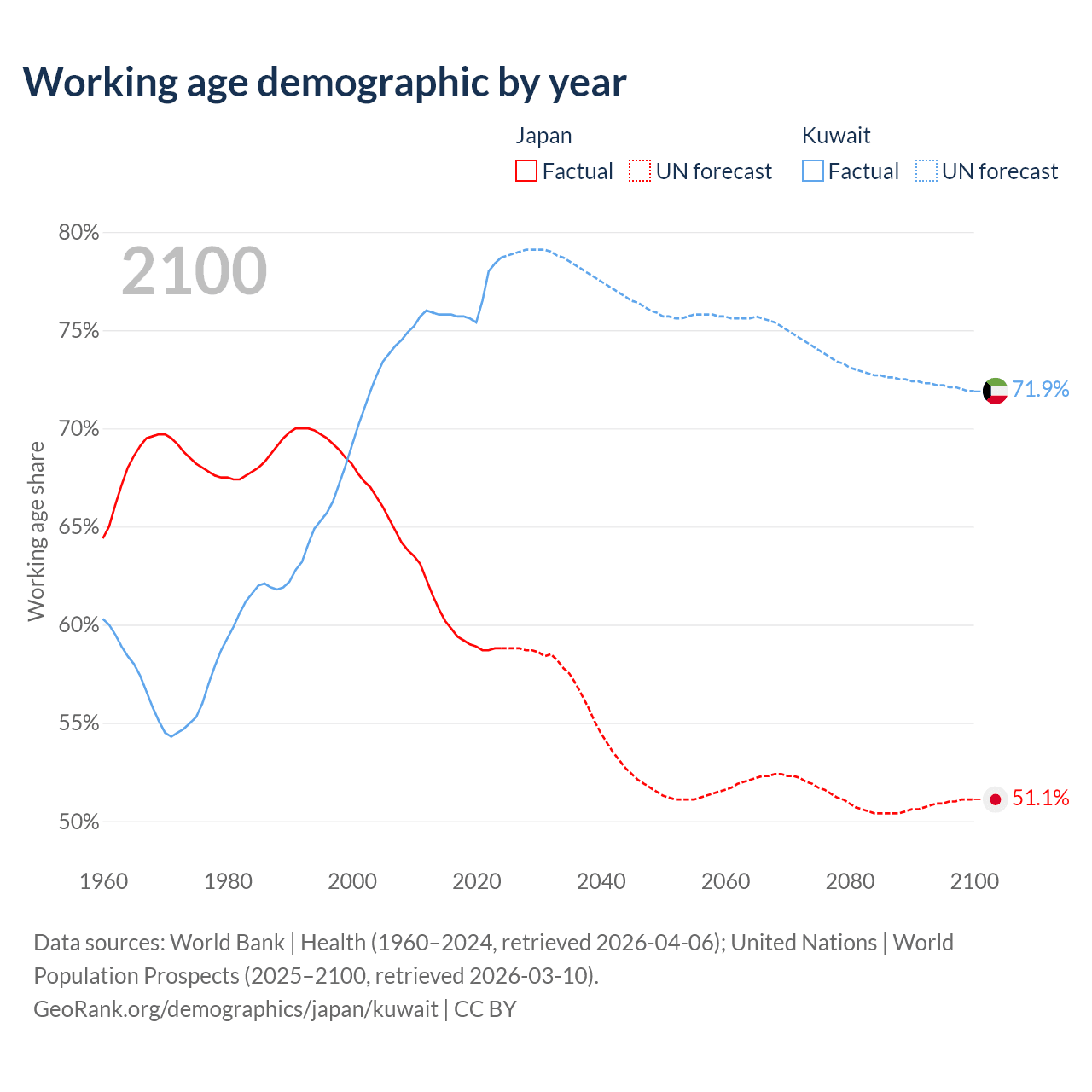 - Japan has 72.1M working age adults (aged 15-64) vs 4.01M in Kuwait.