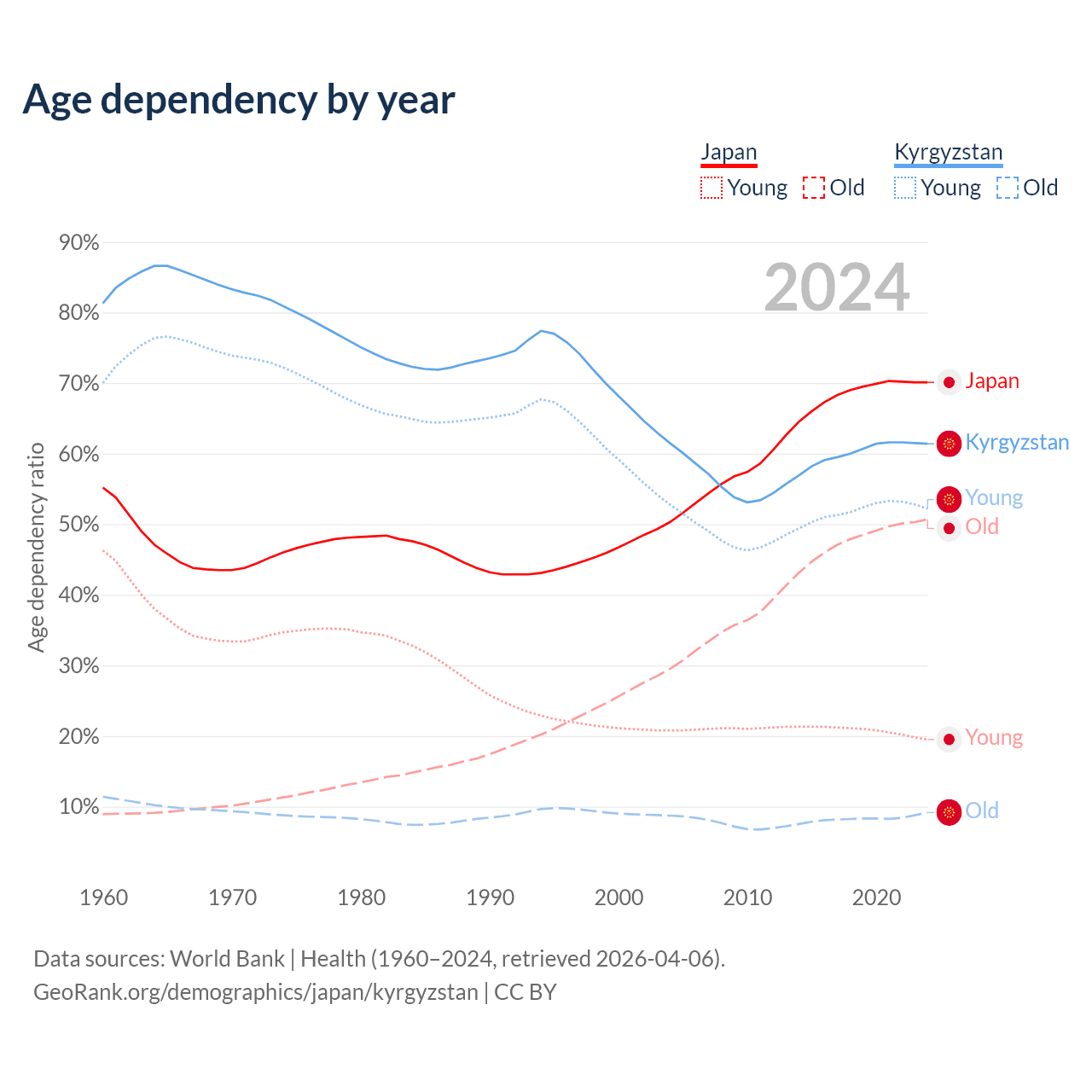 - The share of old-age demographic (65+) in Japan is 29.8% vs 5.68% in Kyrgyzstan.