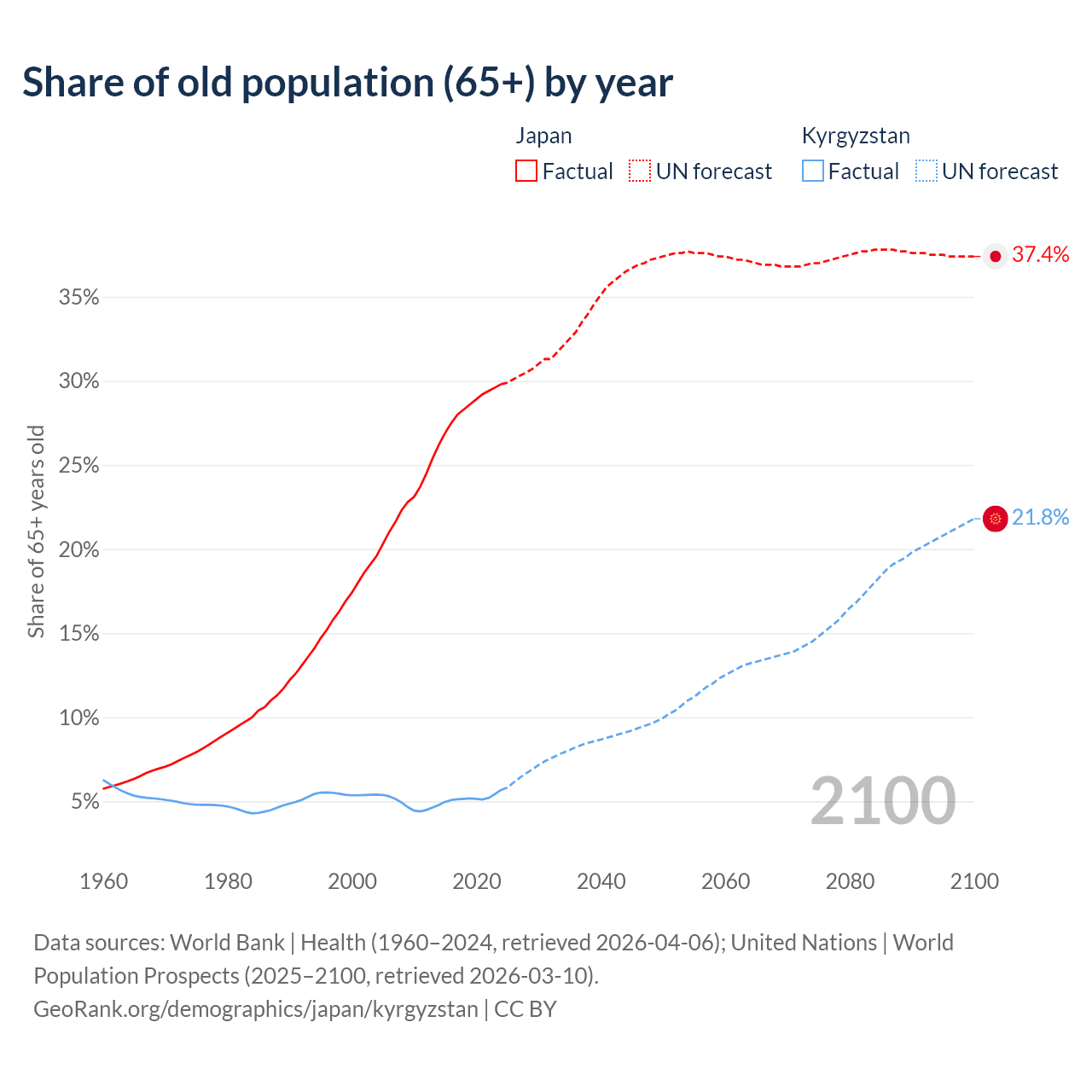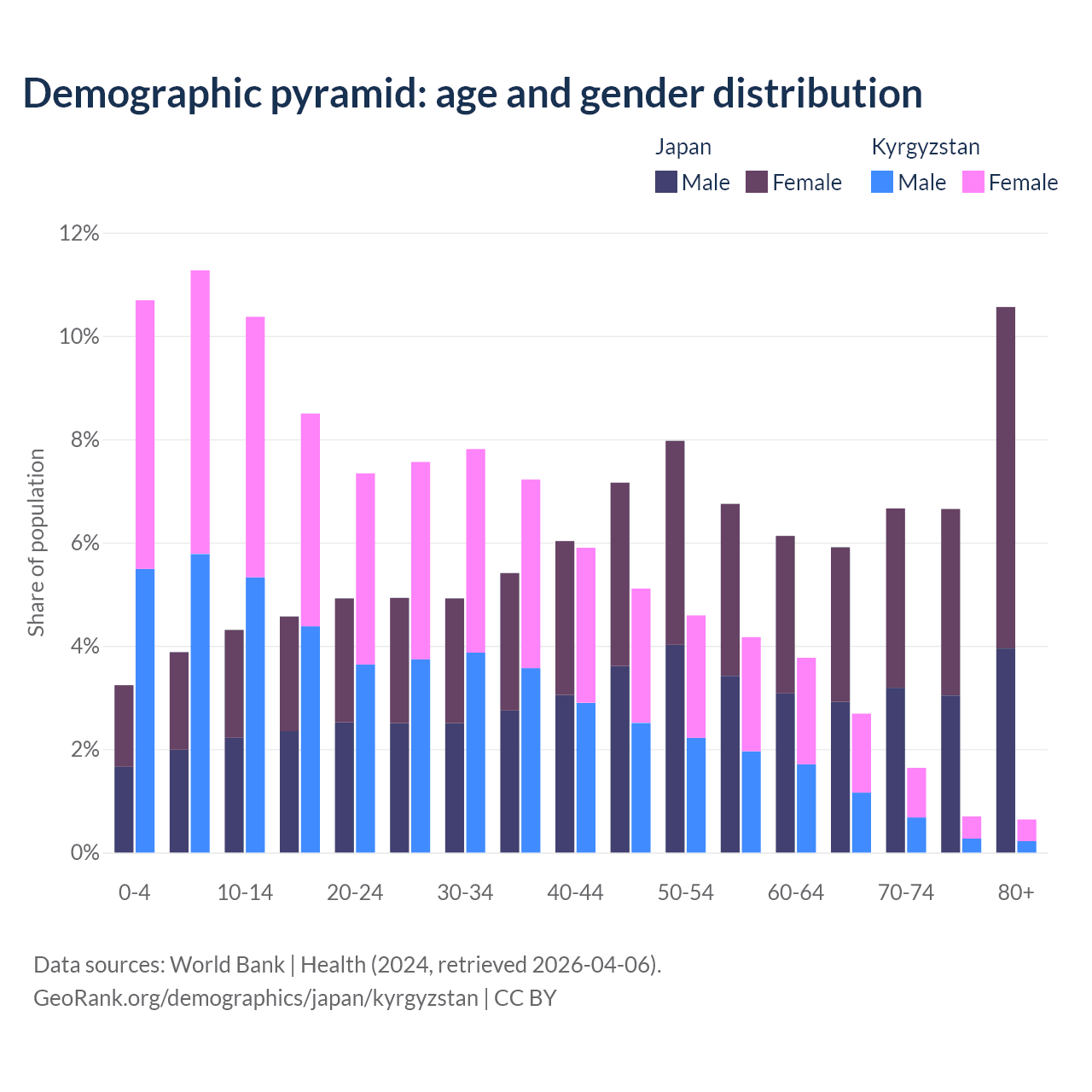 The share of older people aged 65 and over is 29.8% in Japan and 5.68% in Kyrgyzstan. Life expectancy in Japan compared to Kyrgyzstan .