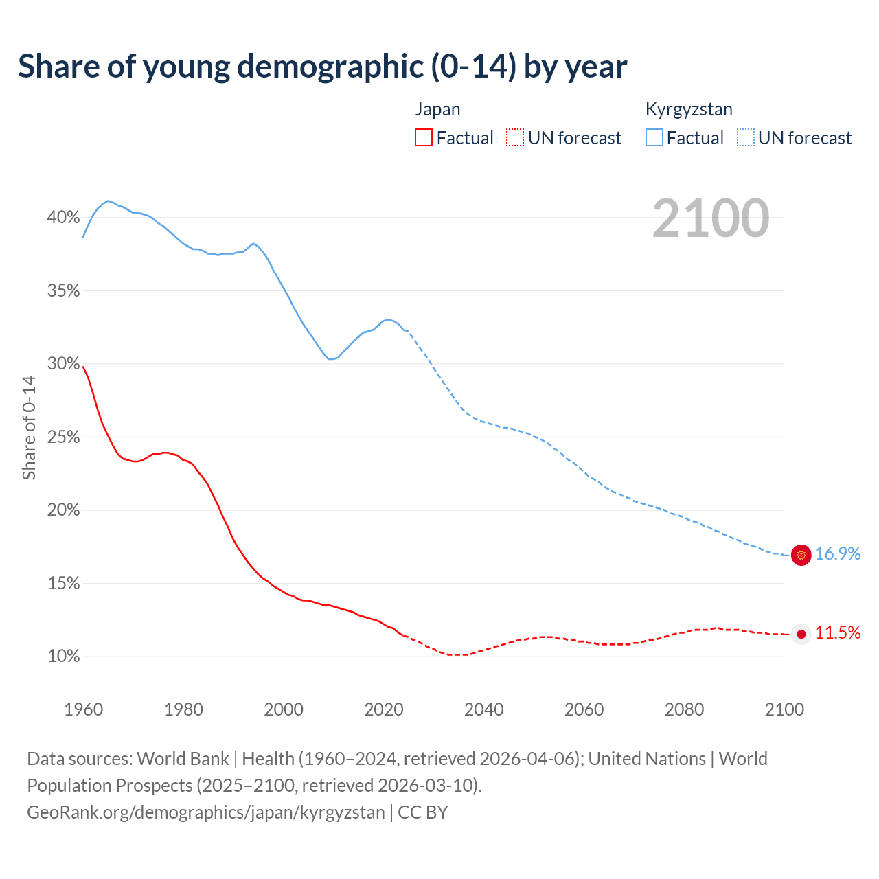 - The share of young demographic (0-15 years old) in Japan is 11.4% vs 32.3% in Kyrgyzstan.