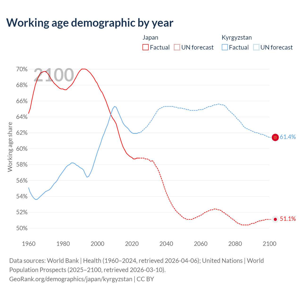 Median age Japan vs Kyrgyzstan, 1960-2100