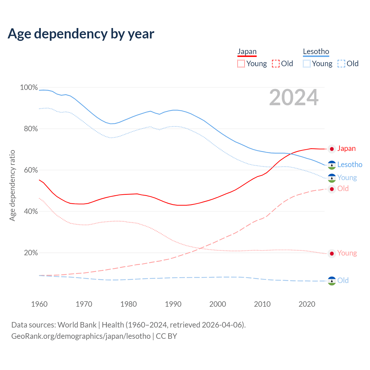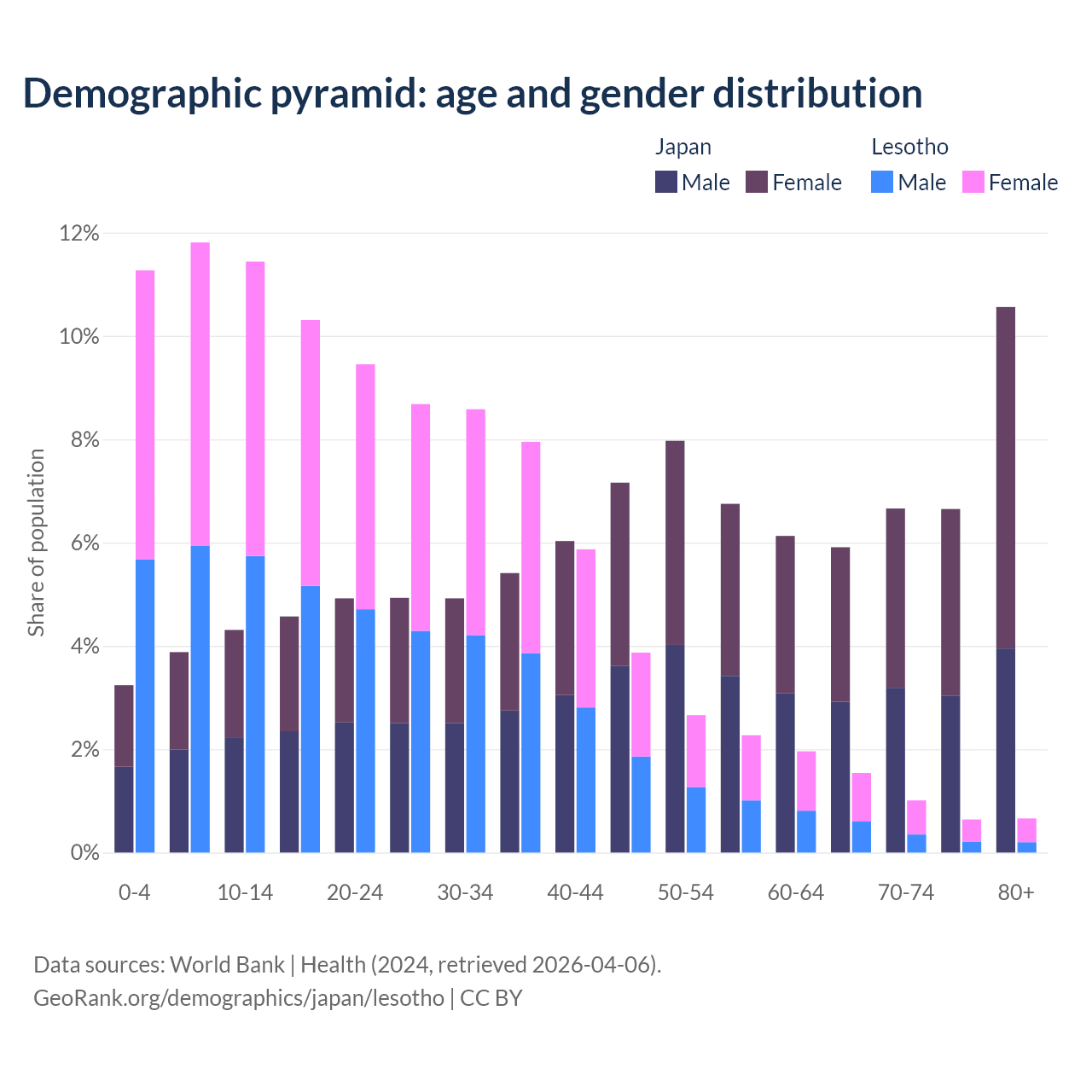- Japan is ranked 2/196 by median age (oldest to youngest) vs 143/196 for Lesotho.