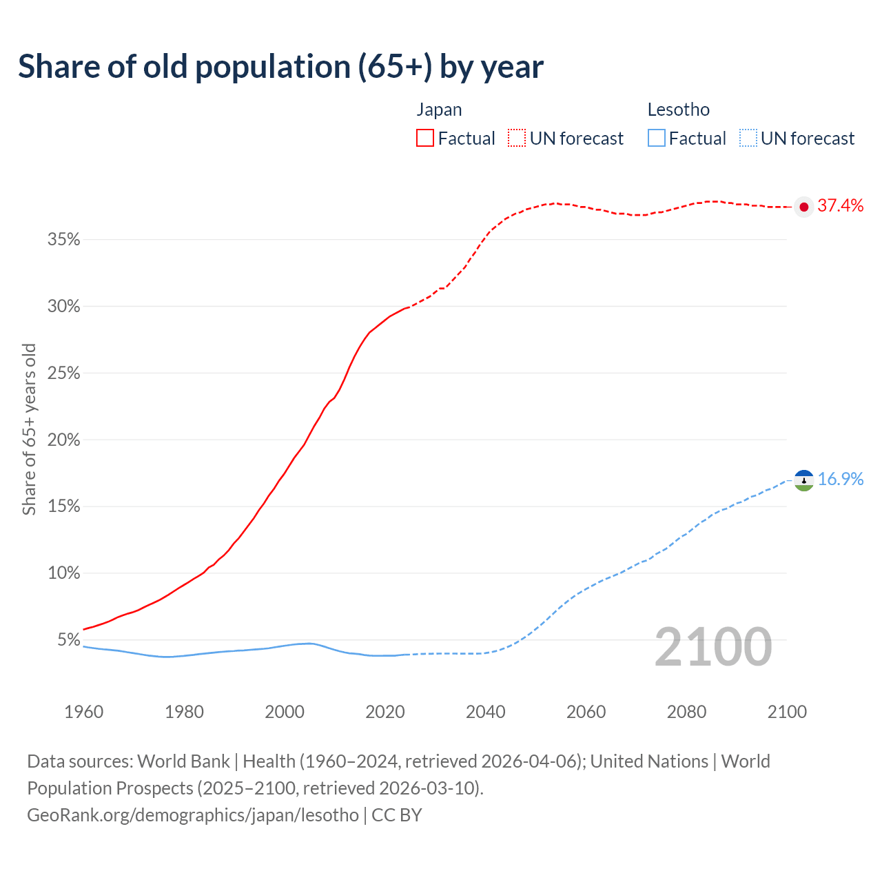 The share of older people aged 65 and over is 29.8% in Japan and 3.86% in Lesotho. Life expectancy in Japan compared to Lesotho .