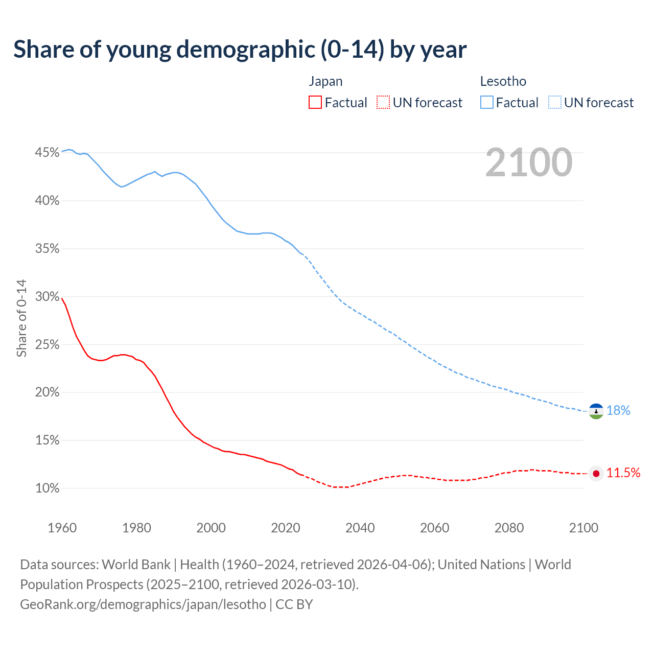 - The share of young demographic (0-15 years old) in Japan is 11.4% vs 34.5% in Lesotho.