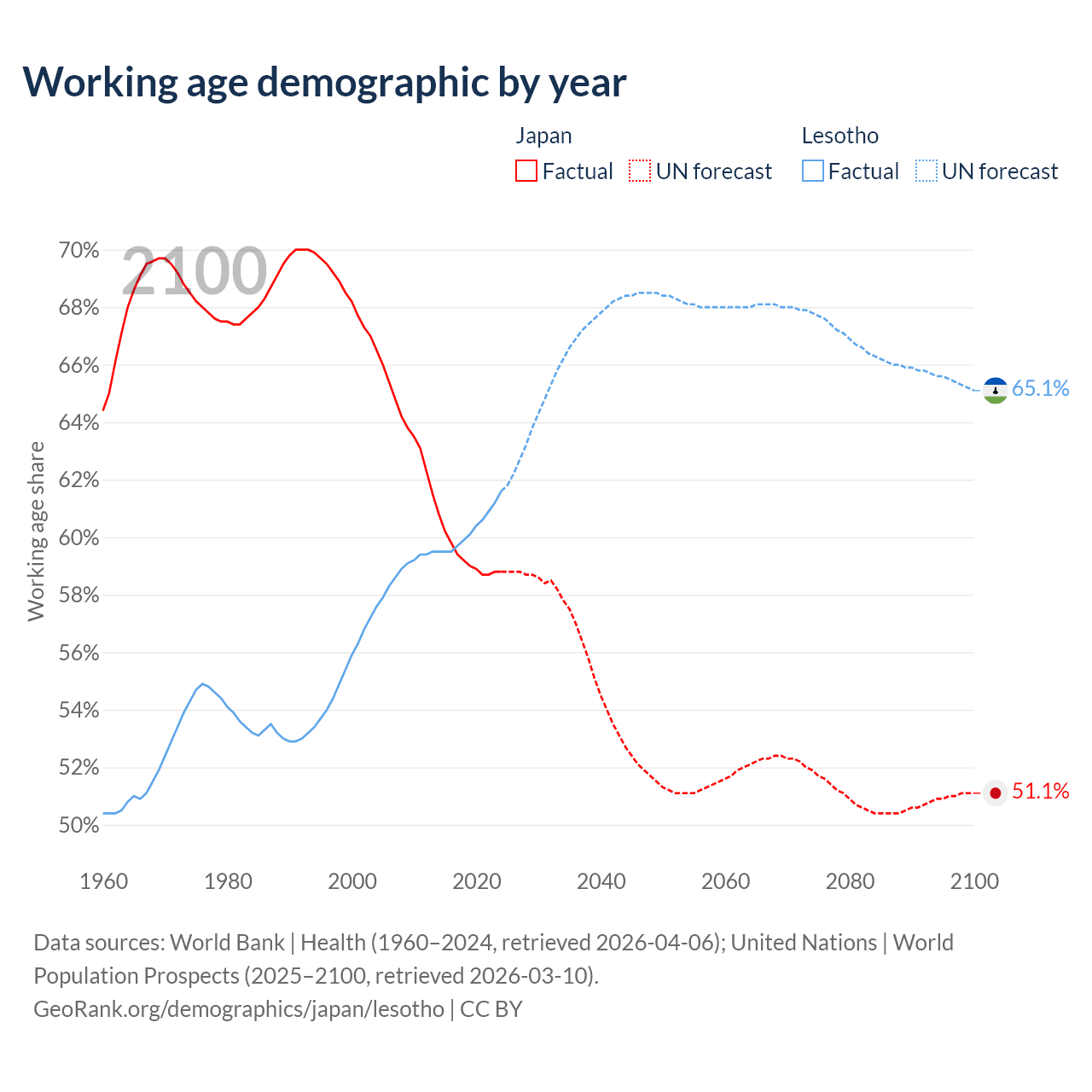 - Japan has 72.1M working age adults (aged 15-64) vs 1.48M in Lesotho.
