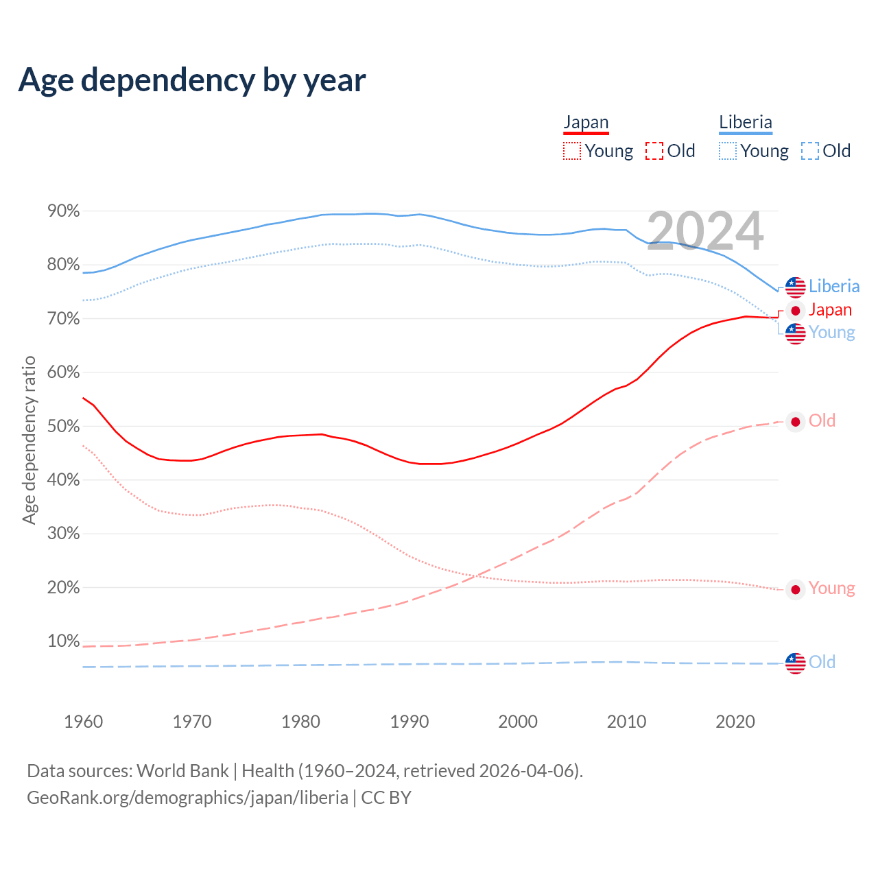 - Japan is ranked 2/196 by median age (oldest to youngest) vs 169/196 for Liberia.
