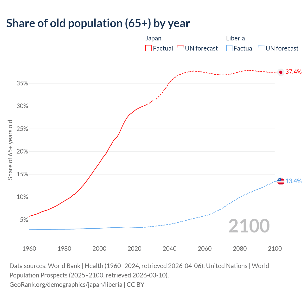 The share of older people aged 65 and over is 29.8% in Japan and 3.3% in Liberia. Life expectancy in Japan compared to Liberia .