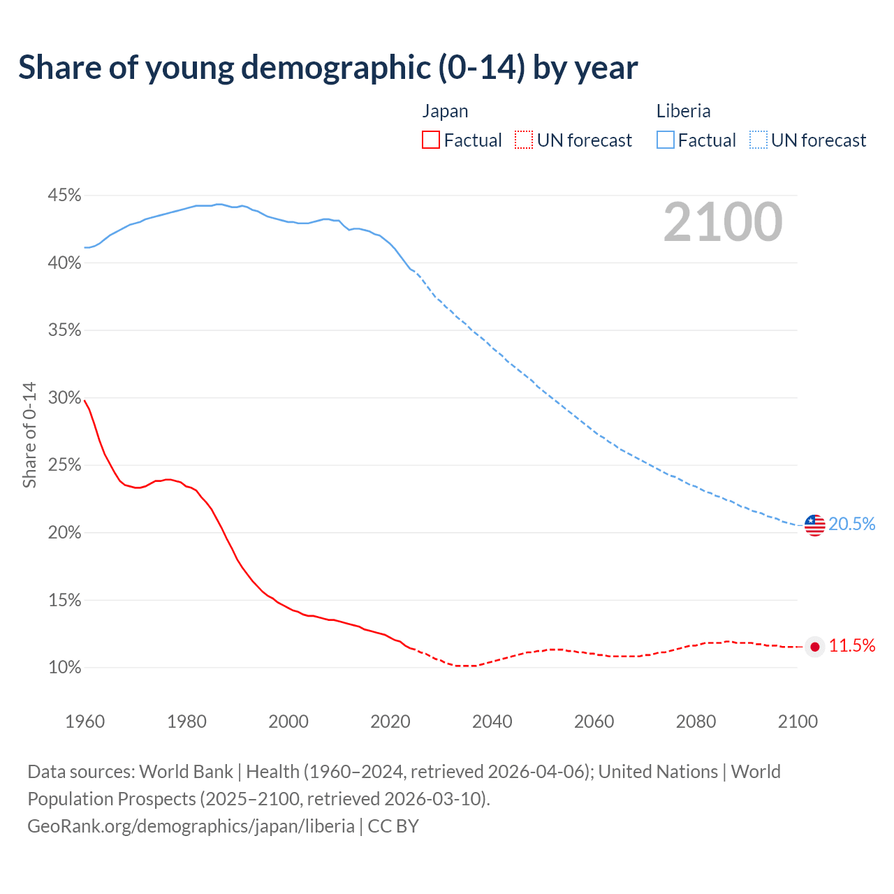- The share of young demographic (0-15 years old) in Japan is 11.4% vs 39.5% in Liberia.