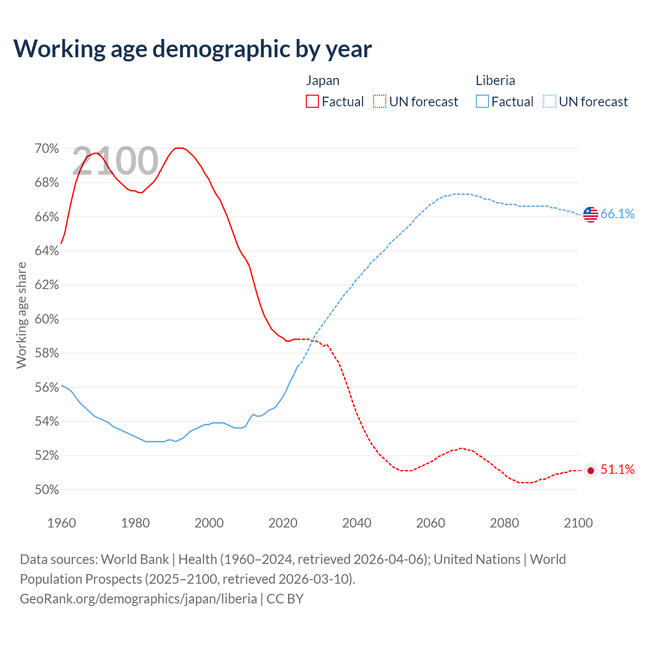- Japan has 72.1M working age adults (aged 15-64) vs 3.37M in Liberia.