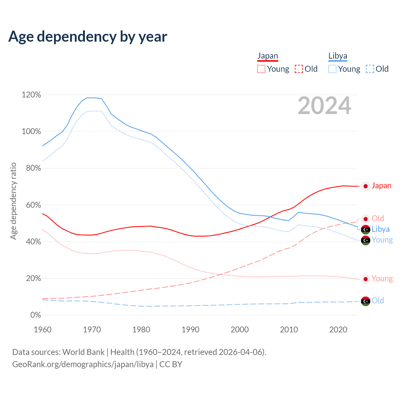 - Japan is ranked 2/196 by median age (oldest to youngest) vs 114/196 for Libya.
