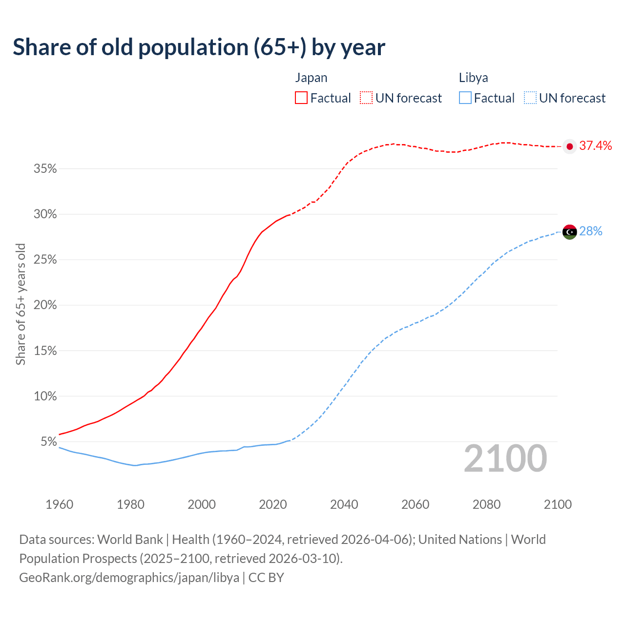 The share of older people aged 65 and over is 29.8% in Japan and 5.02% in Libya. Life expectancy in Japan compared to Libya .