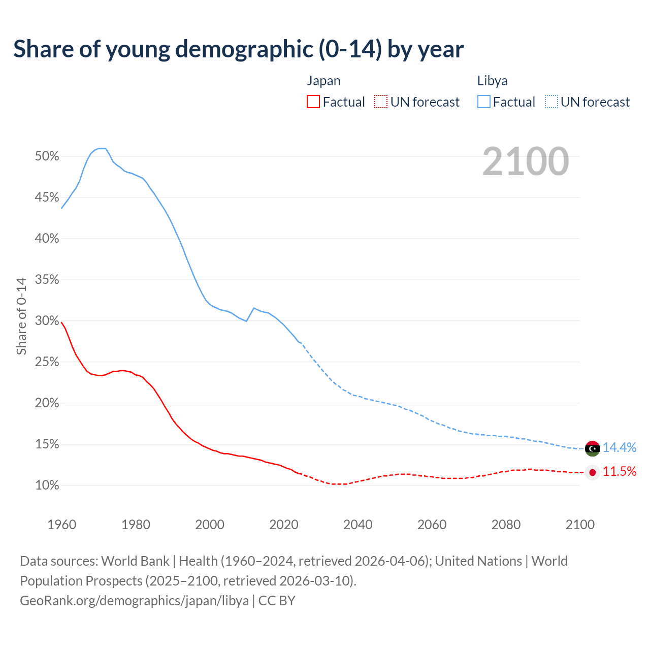 - The share of young demographic (0-15 years old) in Japan is 11.4% vs 27.4% in Libya.