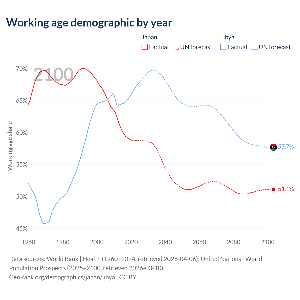 - Japan has 72.1M working age adults (aged 15-64) vs 5.11M in Libya.