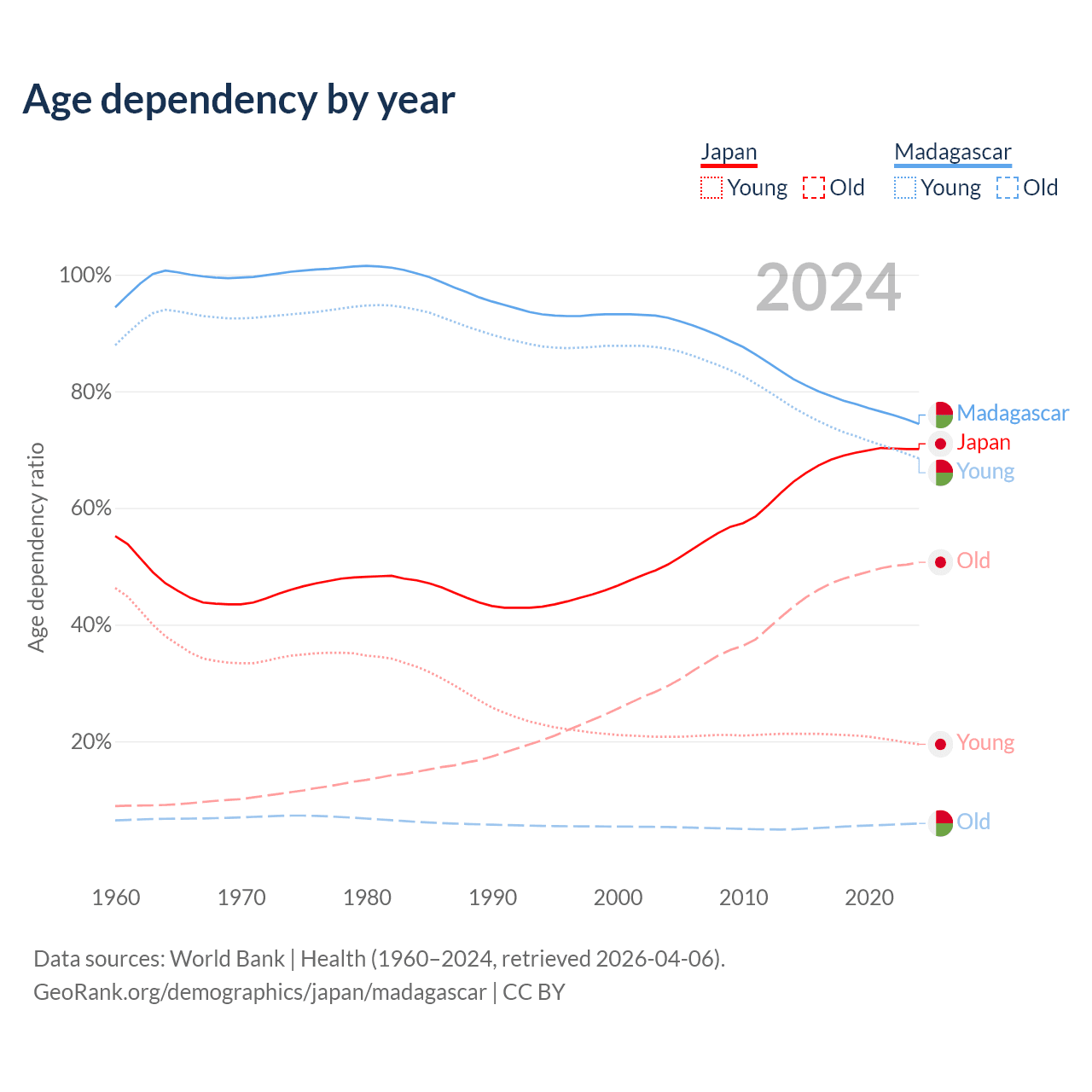 - Japan is ranked 2/196 by median age (oldest to youngest) vs 165/196 for Madagascar.