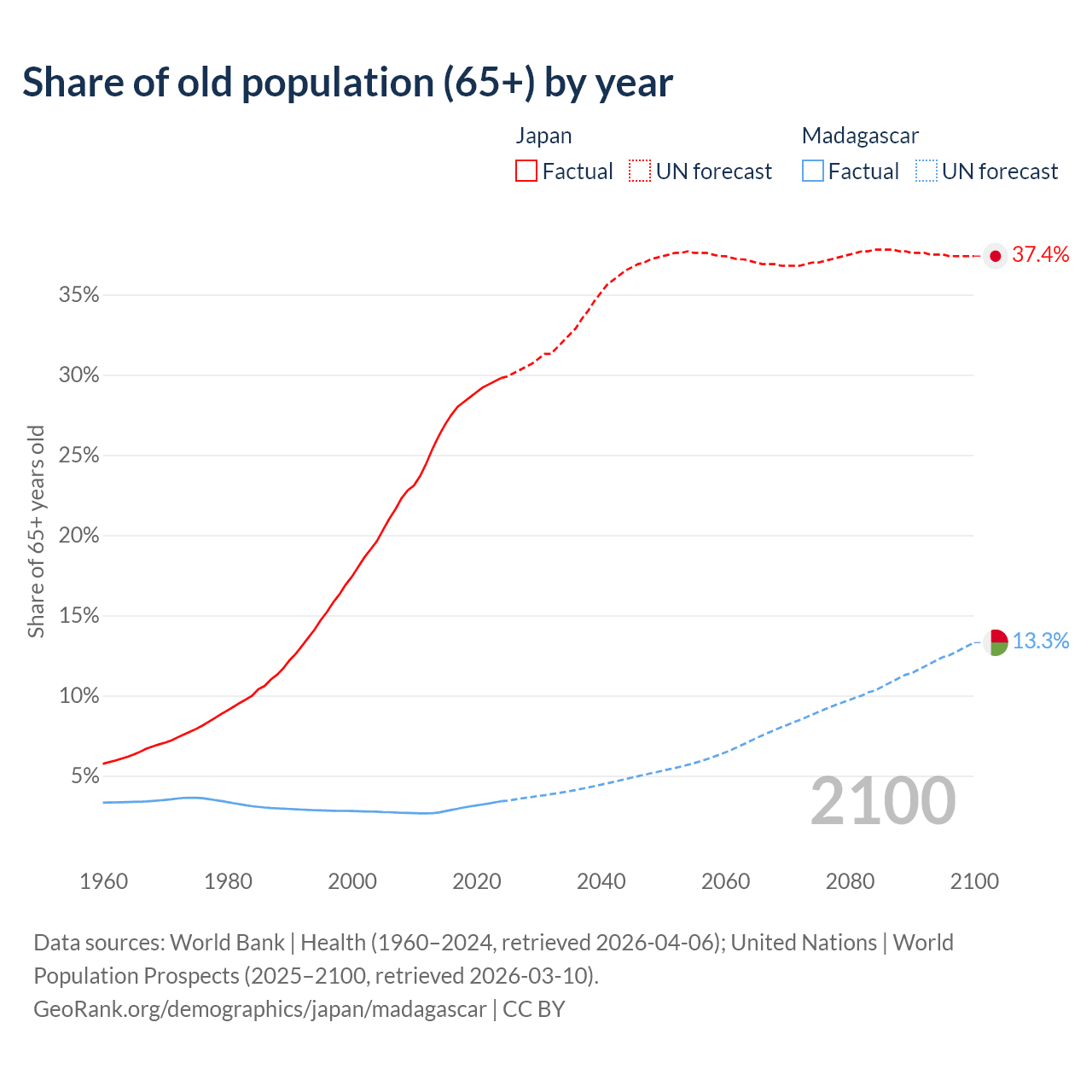 The share of older people aged 65 and over is 29.8% in Japan and 3.41% in Madagascar. Life expectancy in Japan compared to Madagascar .