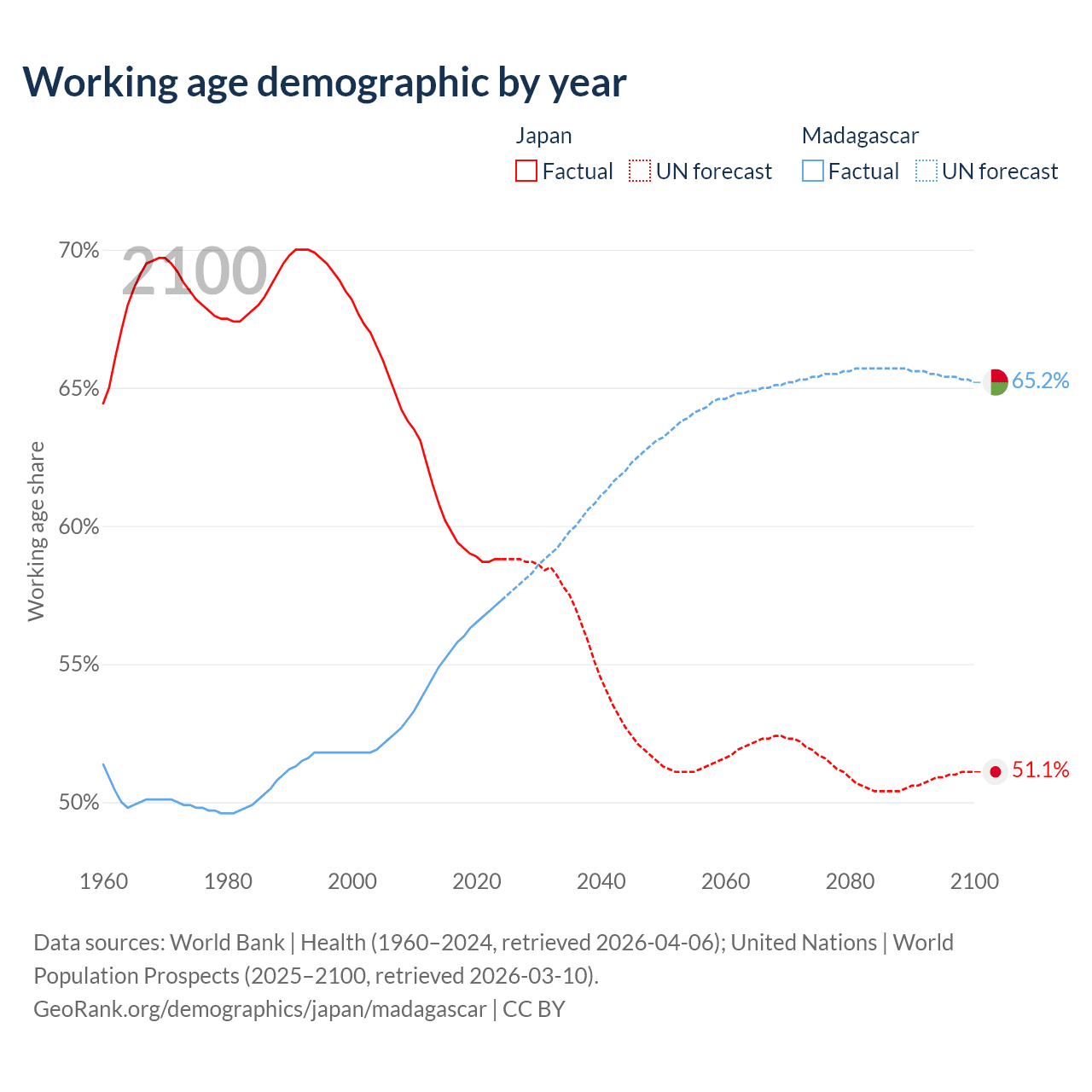 Median age Japan vs Madagascar, 1960-2100