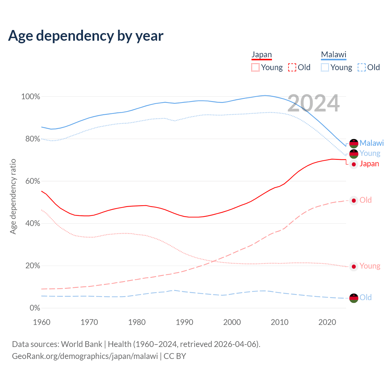 - Japan is ranked 2/196 by median age (oldest to youngest) vs 181/196 for Malawi.