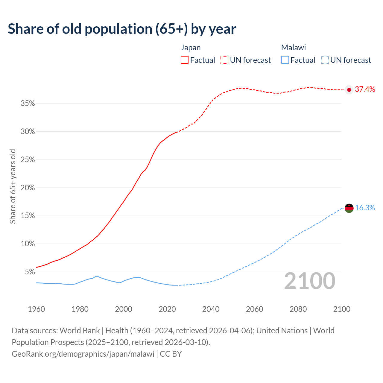 The share of older people aged 65 and over is 29.8% in Japan and 2.59% in Malawi. Life expectancy in Japan compared to Malawi .
