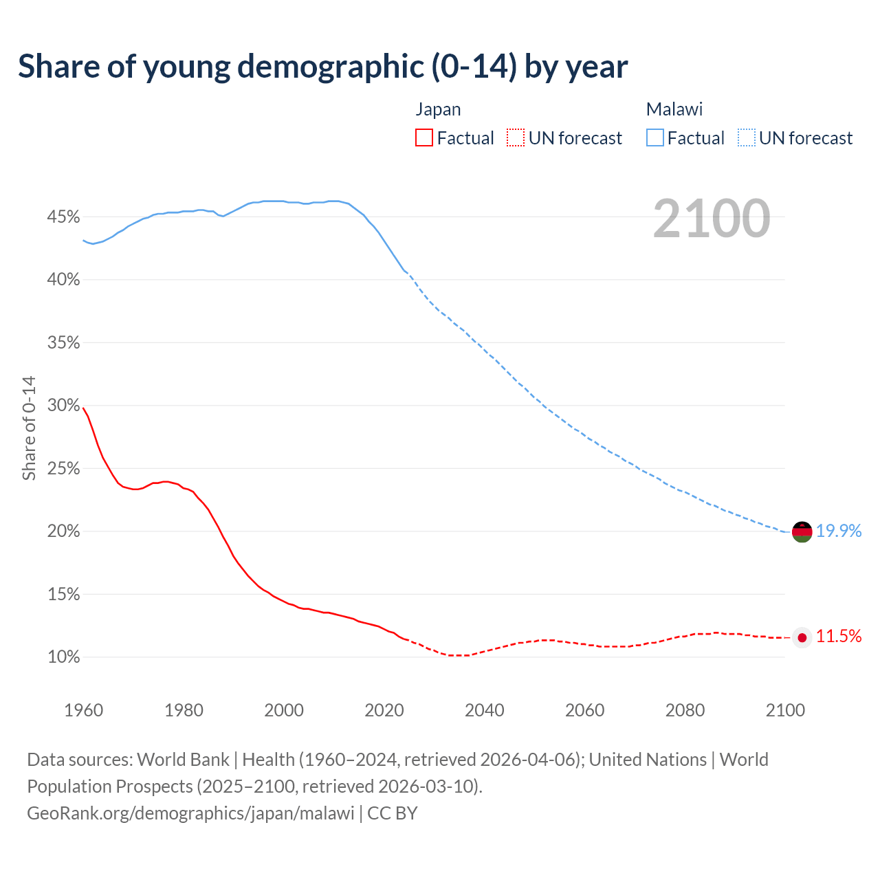 - The share of young demographic (0-15 years old) in Japan is 11.4% vs 40.7% in Malawi.