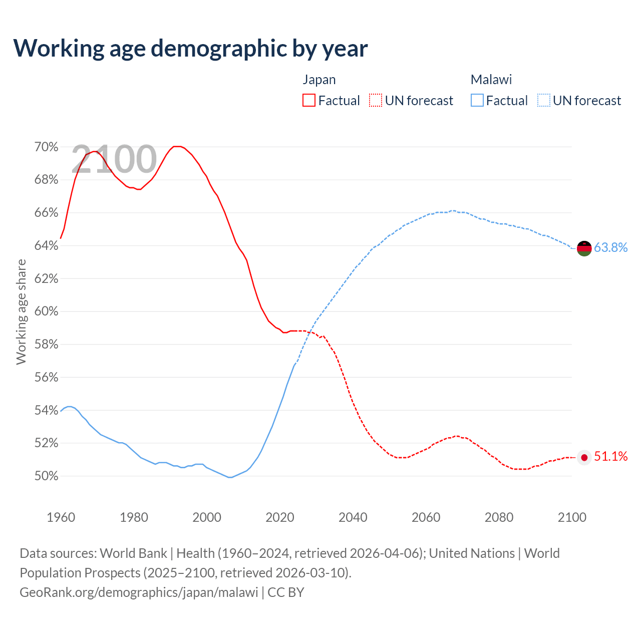 Median age Japan vs Malawi, 1960-2100