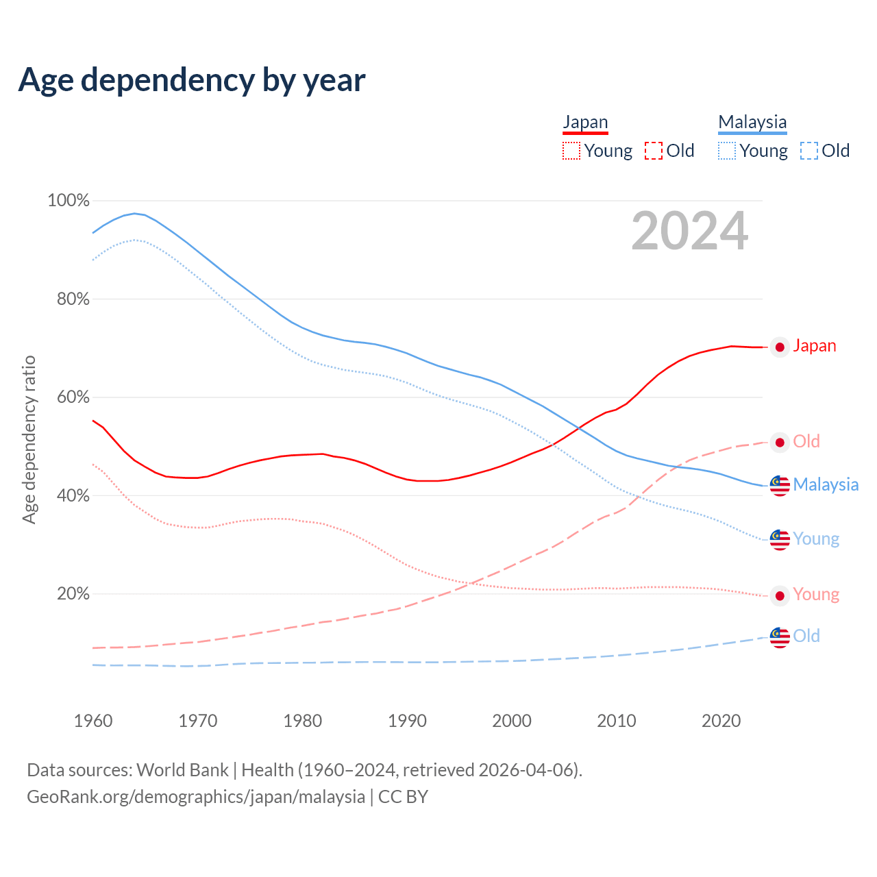 - Japan is ranked 2/196 by median age (oldest to youngest) vs 92/196 for Malaysia.