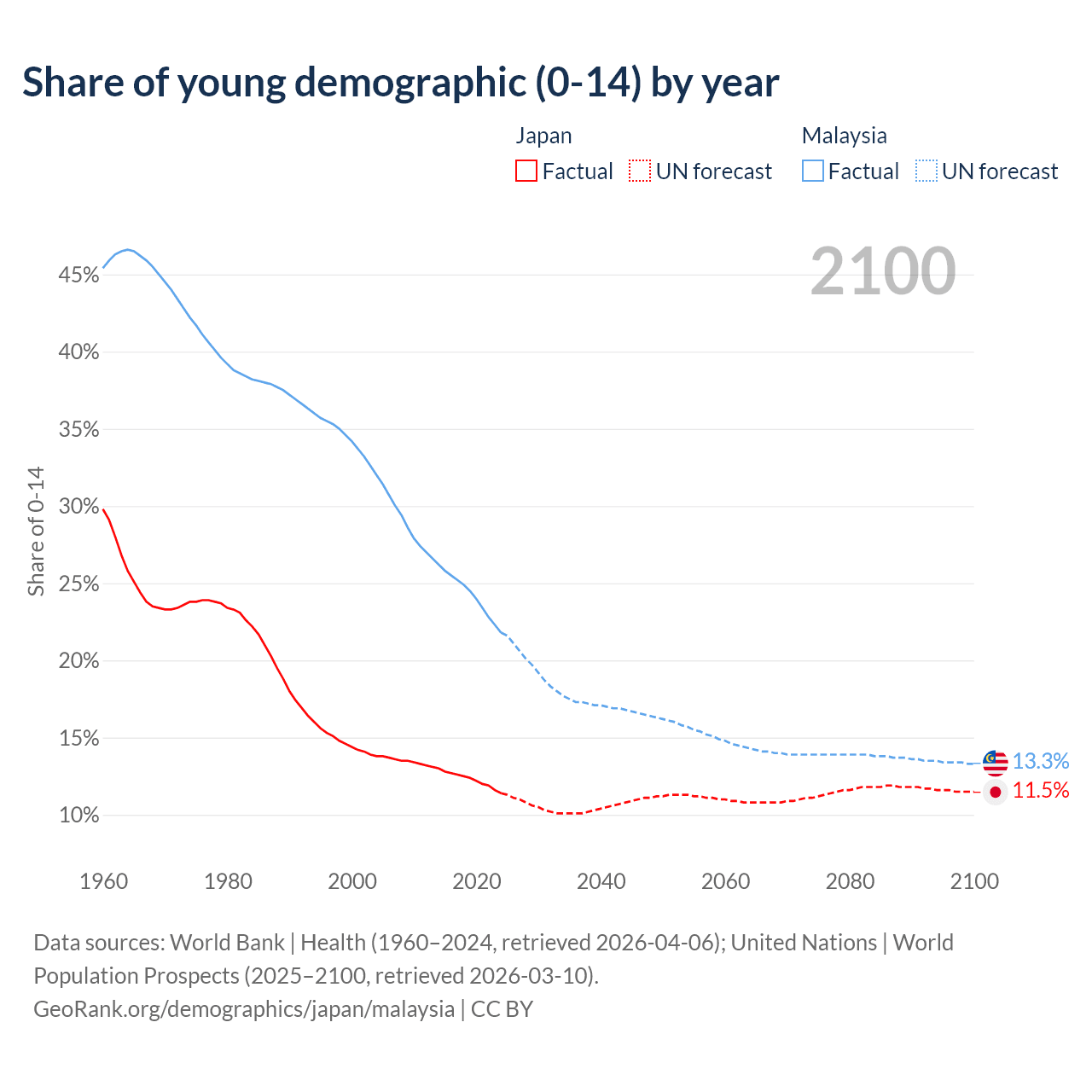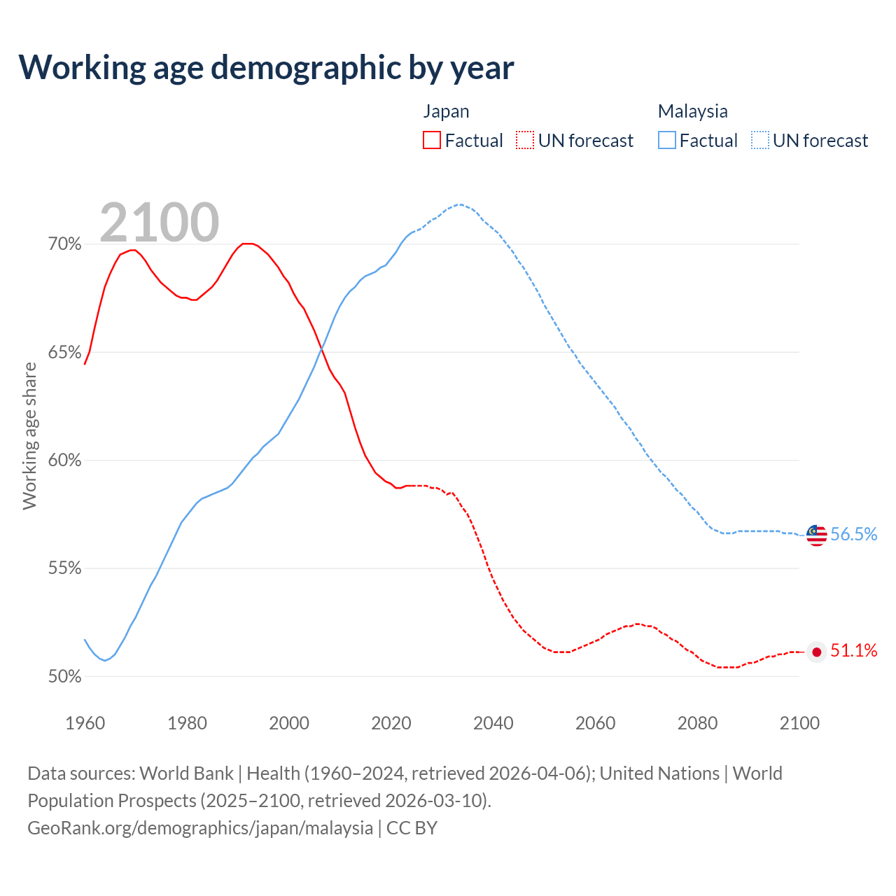 Median age Japan vs Malaysia, 1960-2100