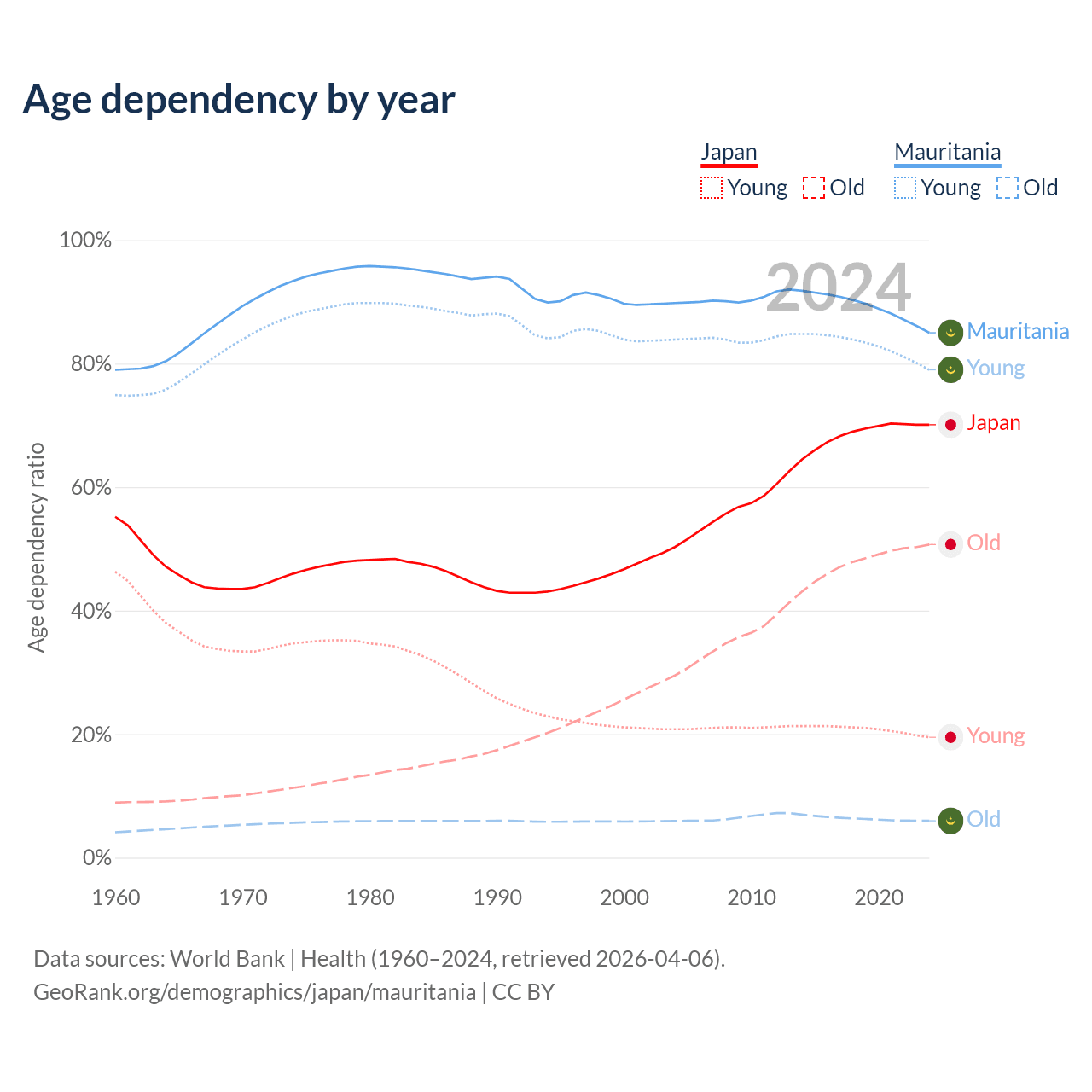 - Japan is ranked 2/196 by median age (oldest to youngest) vs 185/196 for Mauritania.