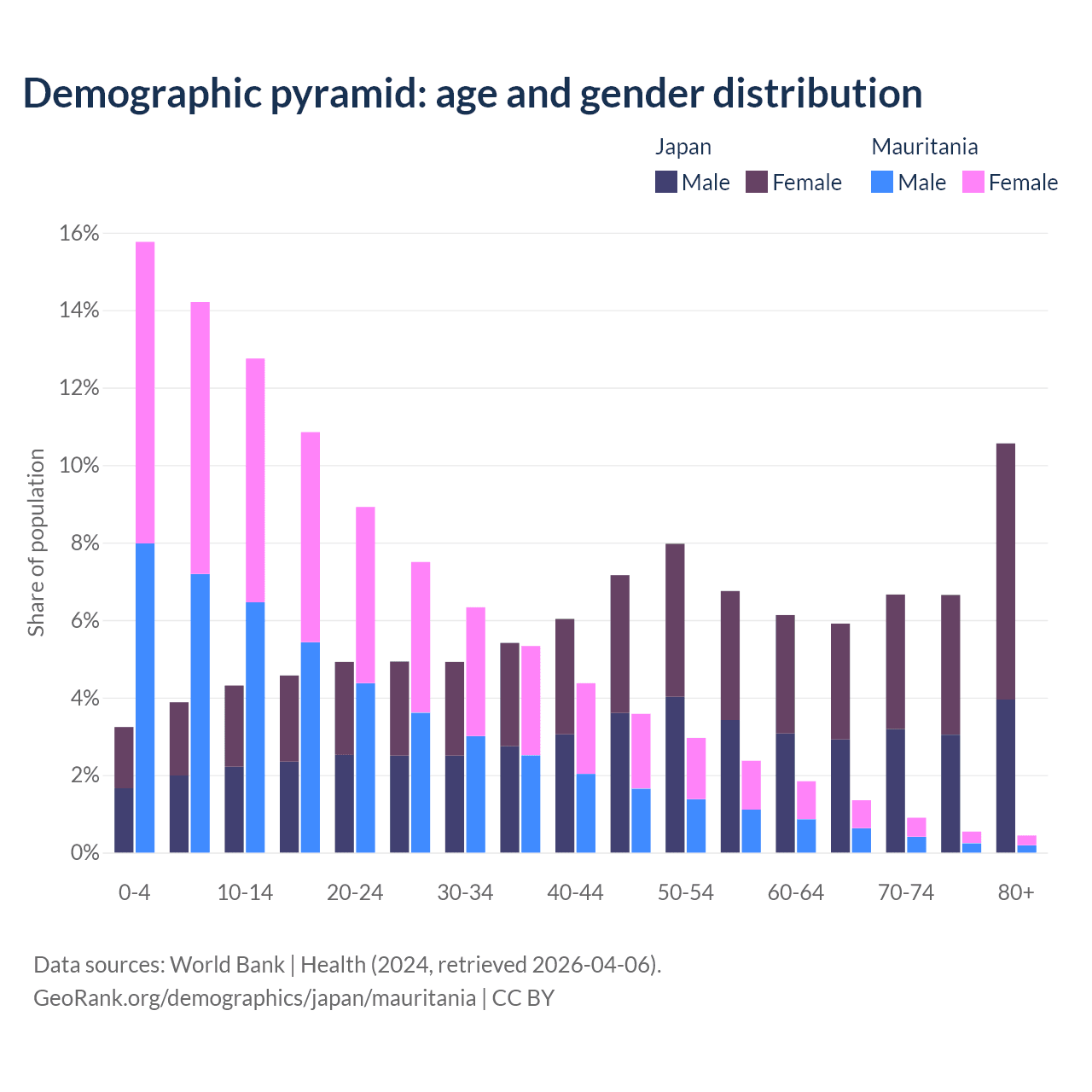 - As of 2026, the population of Japan is 123M vs 5.51M in Mauritania - 22.3 times difference.