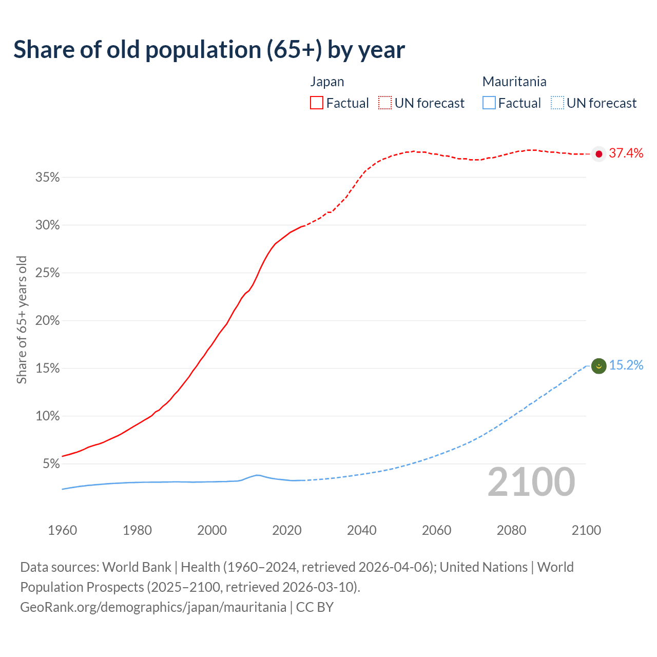 The share of older people aged 65 and over is 29.8% in Japan and 3.23% in Mauritania. Life expectancy in Japan compared to Mauritania .