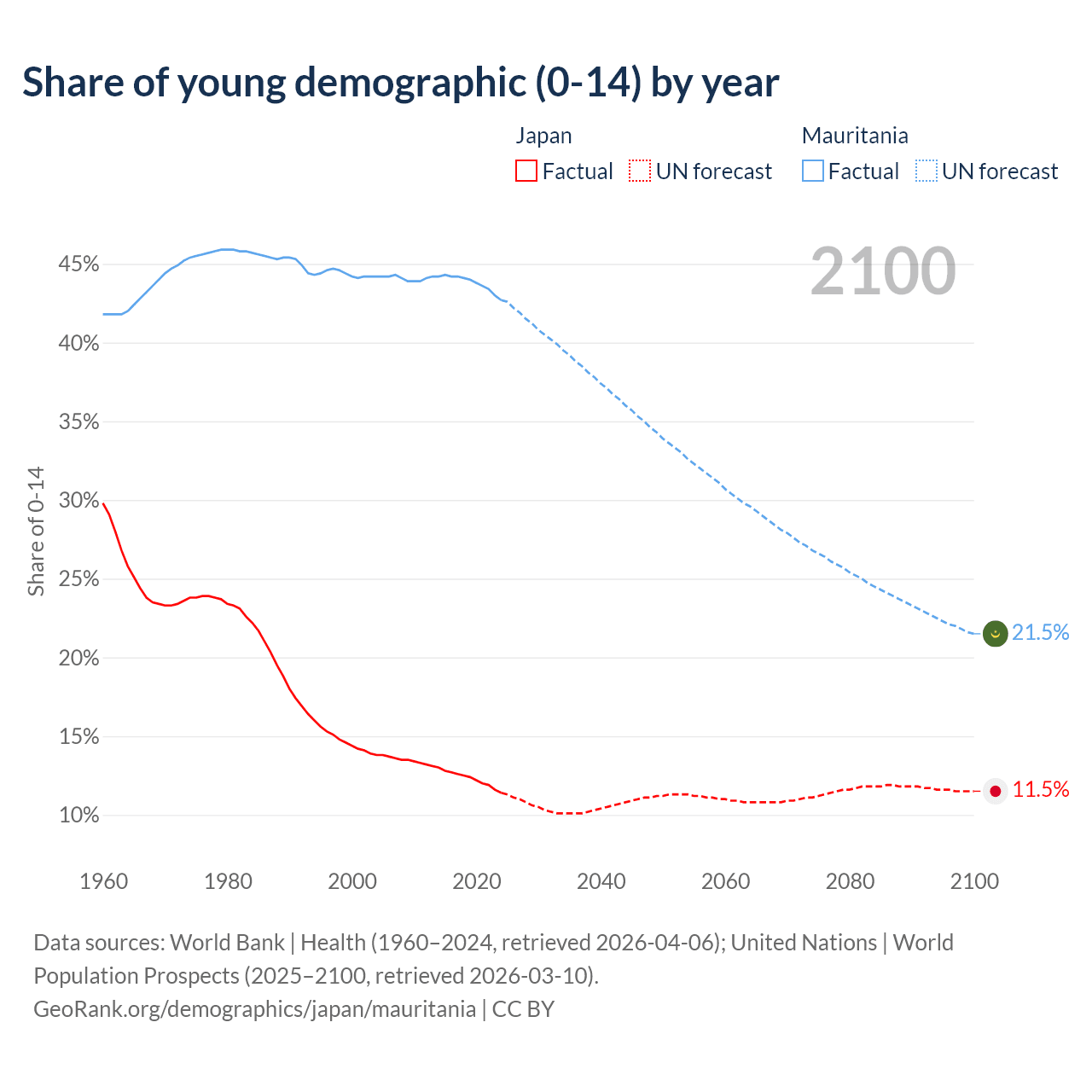 - The share of young demographic (0-15 years old) in Japan is 11.4% vs 42.7% in Mauritania.