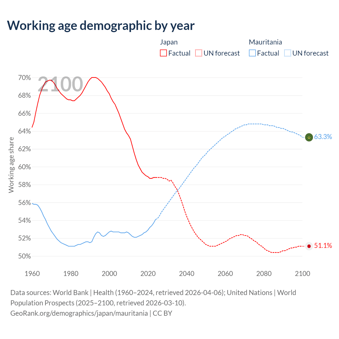 - Japan has 72.1M working age adults (aged 15-64) vs 2.98M in Mauritania.