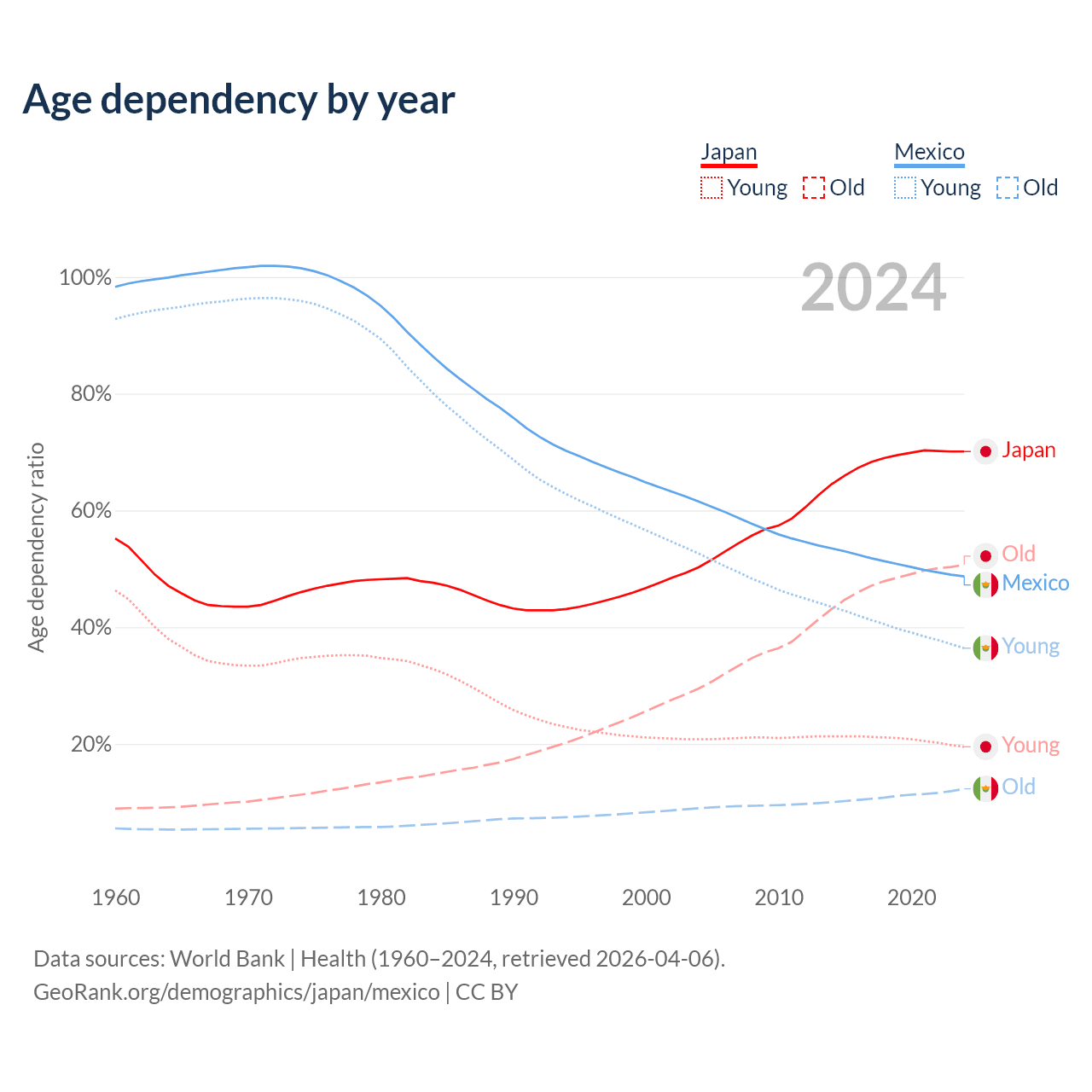 - Japan is ranked 2/196 by median age (oldest to youngest) vs 102/196 for Mexico.