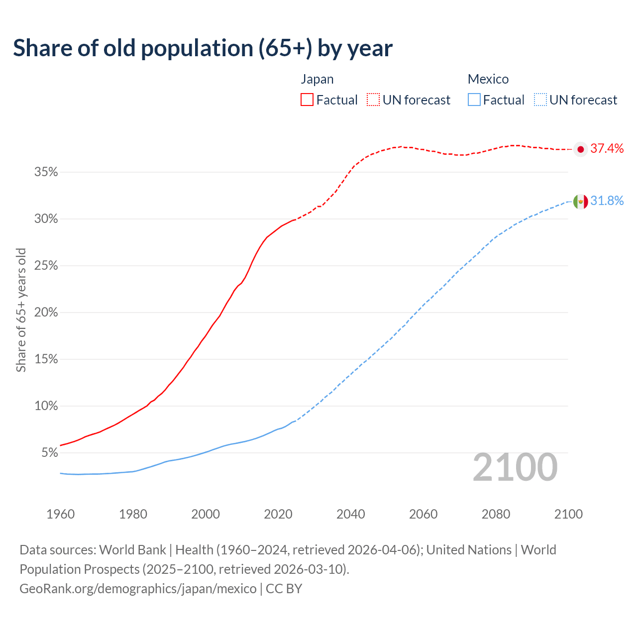 The share of older people aged 65 and over is 29.8% in Japan and 8.25% in Mexico. Life expectancy in Japan compared to Mexico .
