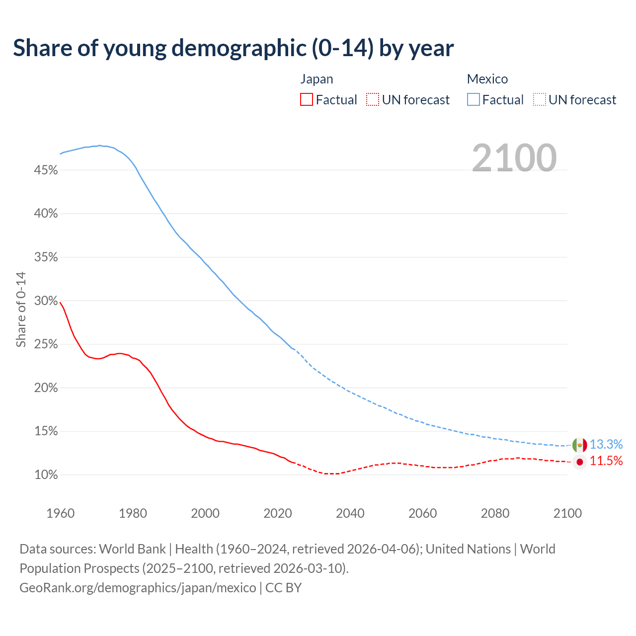- The share of young demographic (0-15 years old) in Japan is 11.4% vs 24.5% in Mexico.