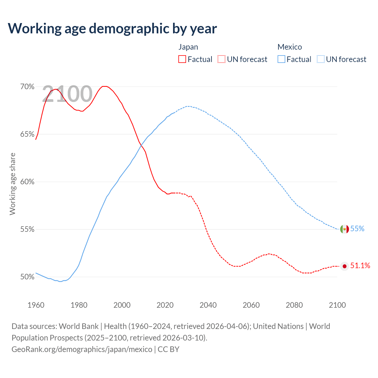 Median age Japan vs Mexico, 1960-2100